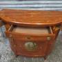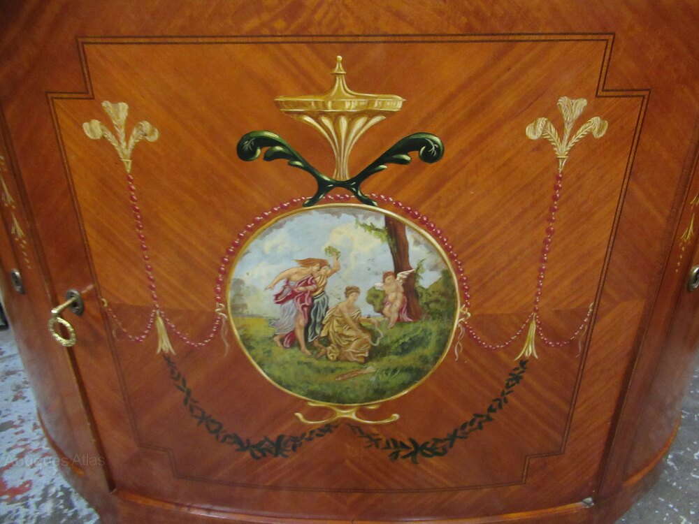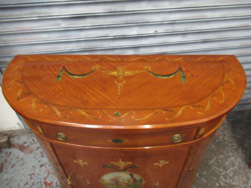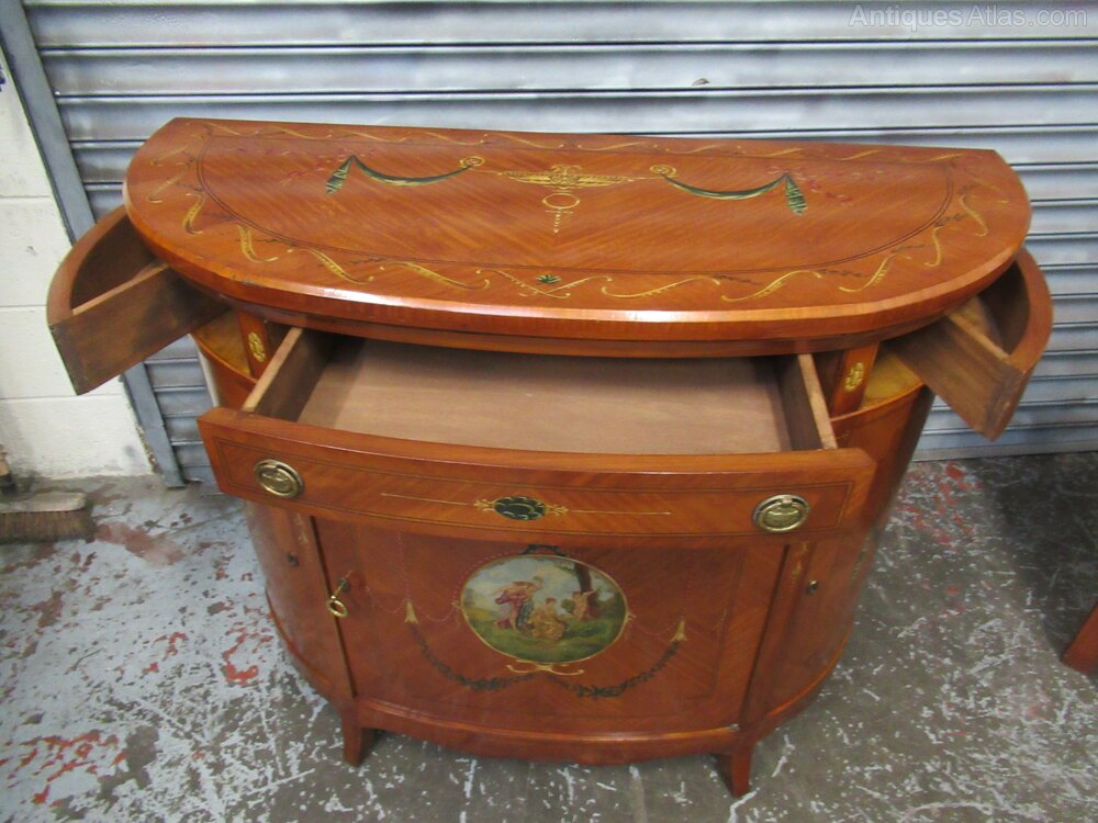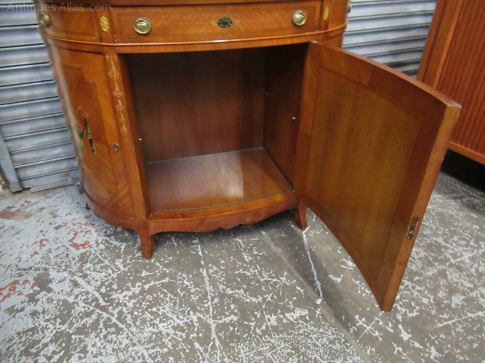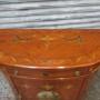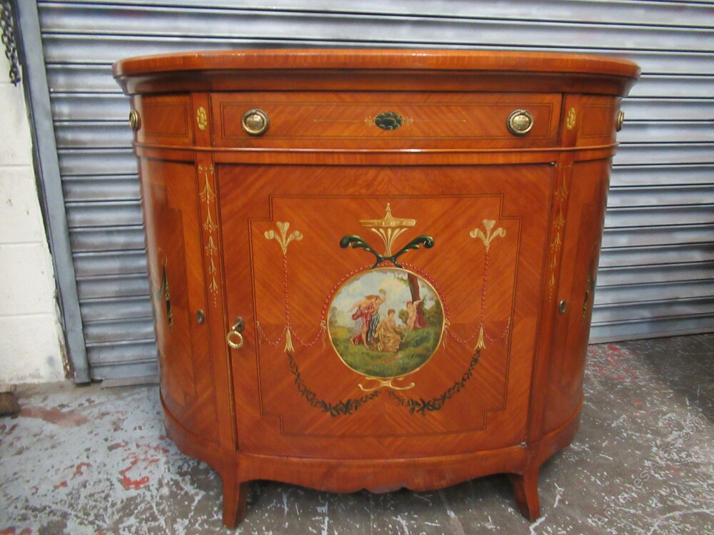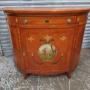 Half round side cabinet with a painted decorated finish to the top and front . It has three drawers to the top , with three cupboards below. all with glass shelves.Date1980s