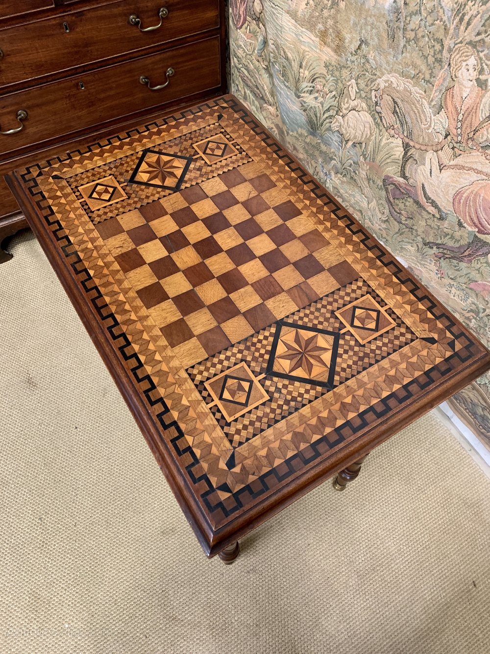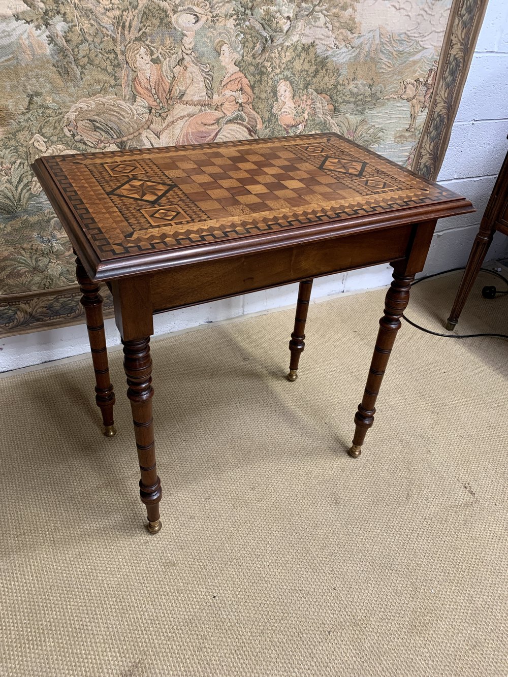 ITEM DETAILSA stunning 19th Century (1890) antique table. The top inlaid with the pattern of a games board. On brass feet with a single drawer to one end. Original lock and working key.