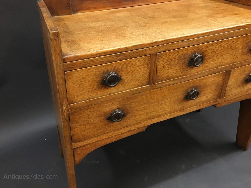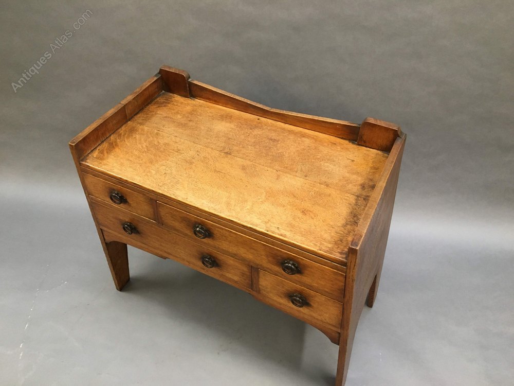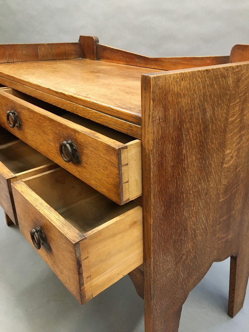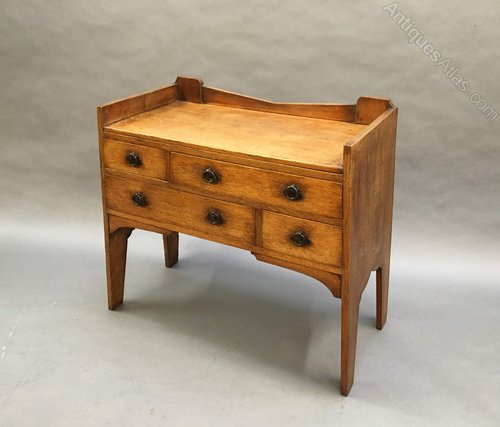 A very stylish oak chest of flared form, the galleried top over arrangement of 4 drawers with ring handles, attributed Liberty & Co.(width at base 99cm, at top 85)