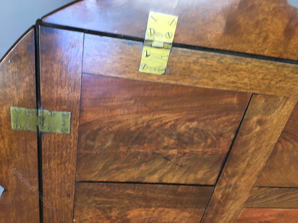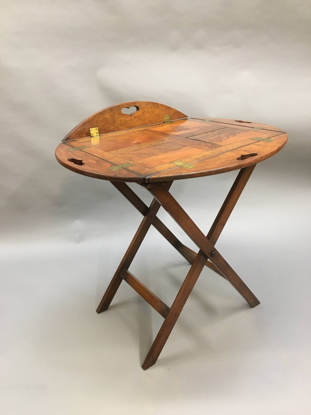 Figured mahogany of panelled construction with drop sides, raised on X folding base.the tray when open 88 x 76 cm