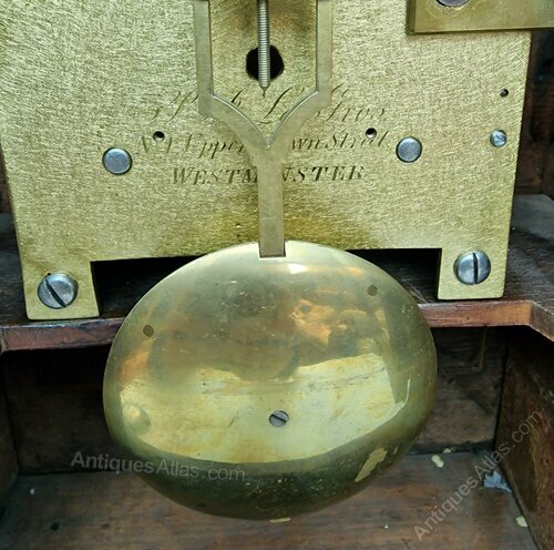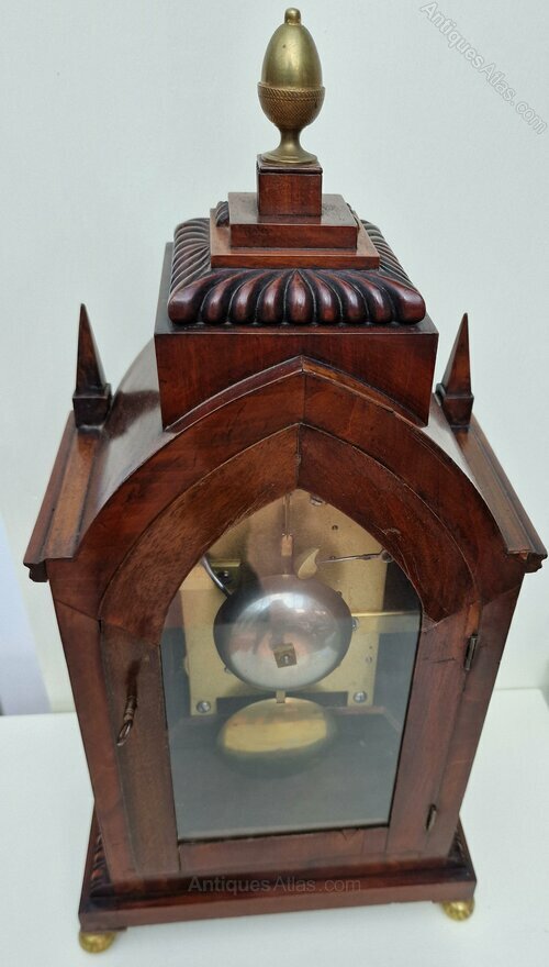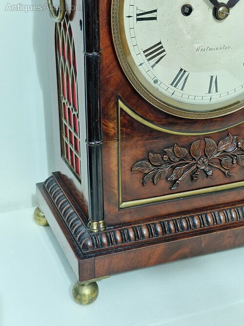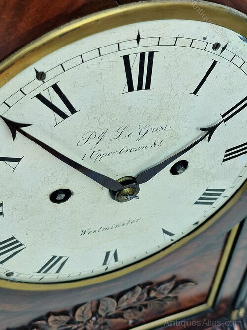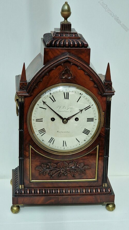 An English Georgian twin fusee bracket clock. An elegant mahogany case with a stepped pediment and the original finial. Regency Gothic design features. Brass capped side columns. Brass sound fretted side panels with silk backing. A cast brass bezel with convex glass and standing on brass ball feet. Brass edged, recessed front panel with carved foliage. An arched glass back door. A convex dial with blued steel hands signed 'P J Le Gros 1, Upper Crown Street Westminster (London)'. A quality double fusee mechanism striking the hours on a bell of 8-day duration. A nice quality graduated scale pendulum adjustment. Engraved by the maker to the backplate. Circa 1825.Peter Le Gros of London is recorded in Loomes' 'Watchmakers & Clockmakers of The World' book as working in 1828. He is also noted as a mechanical model maker so a talented maker.