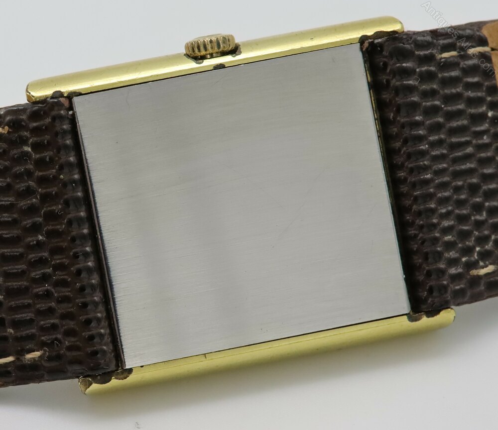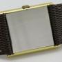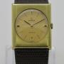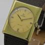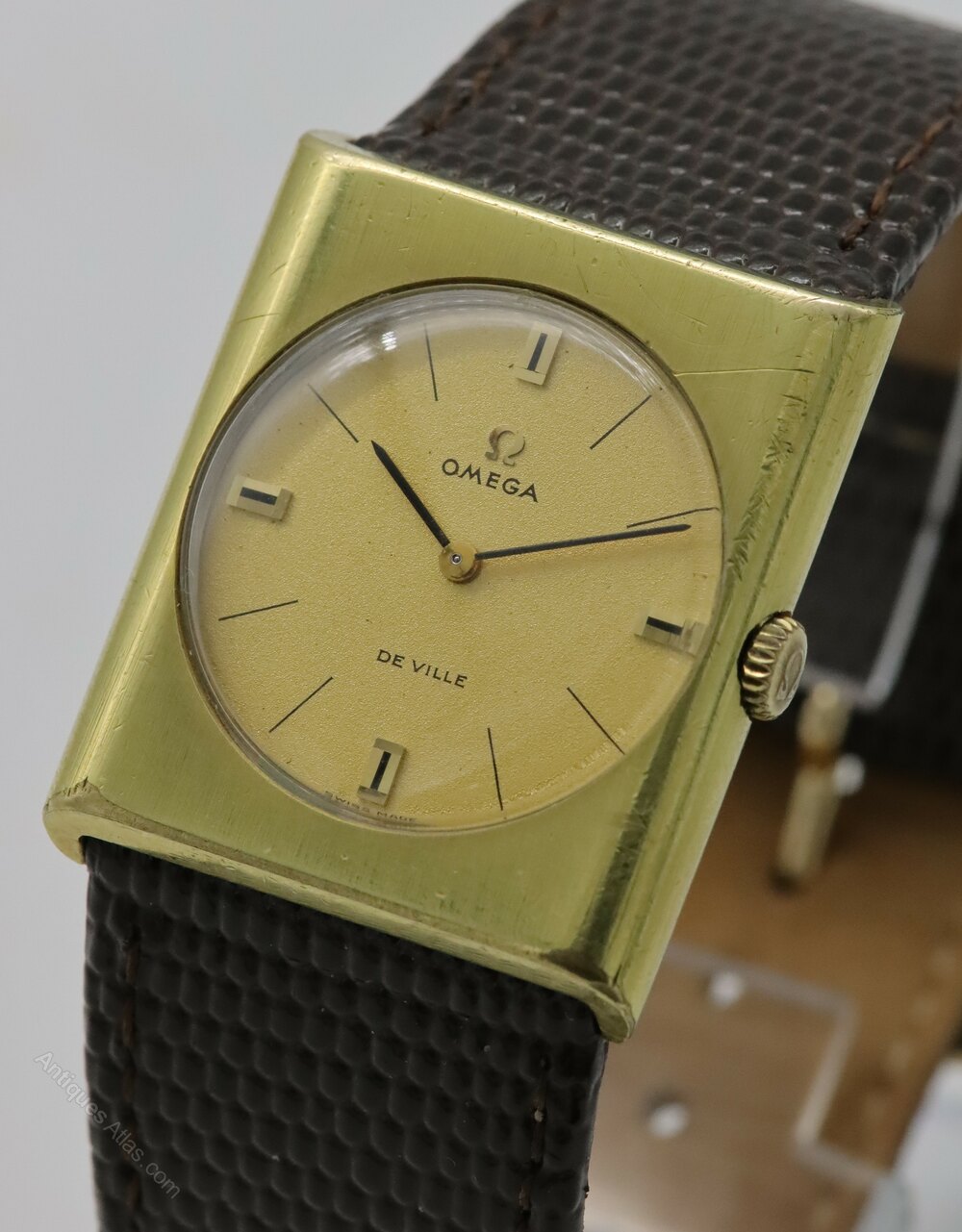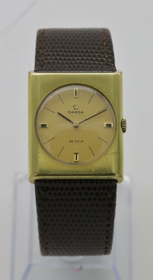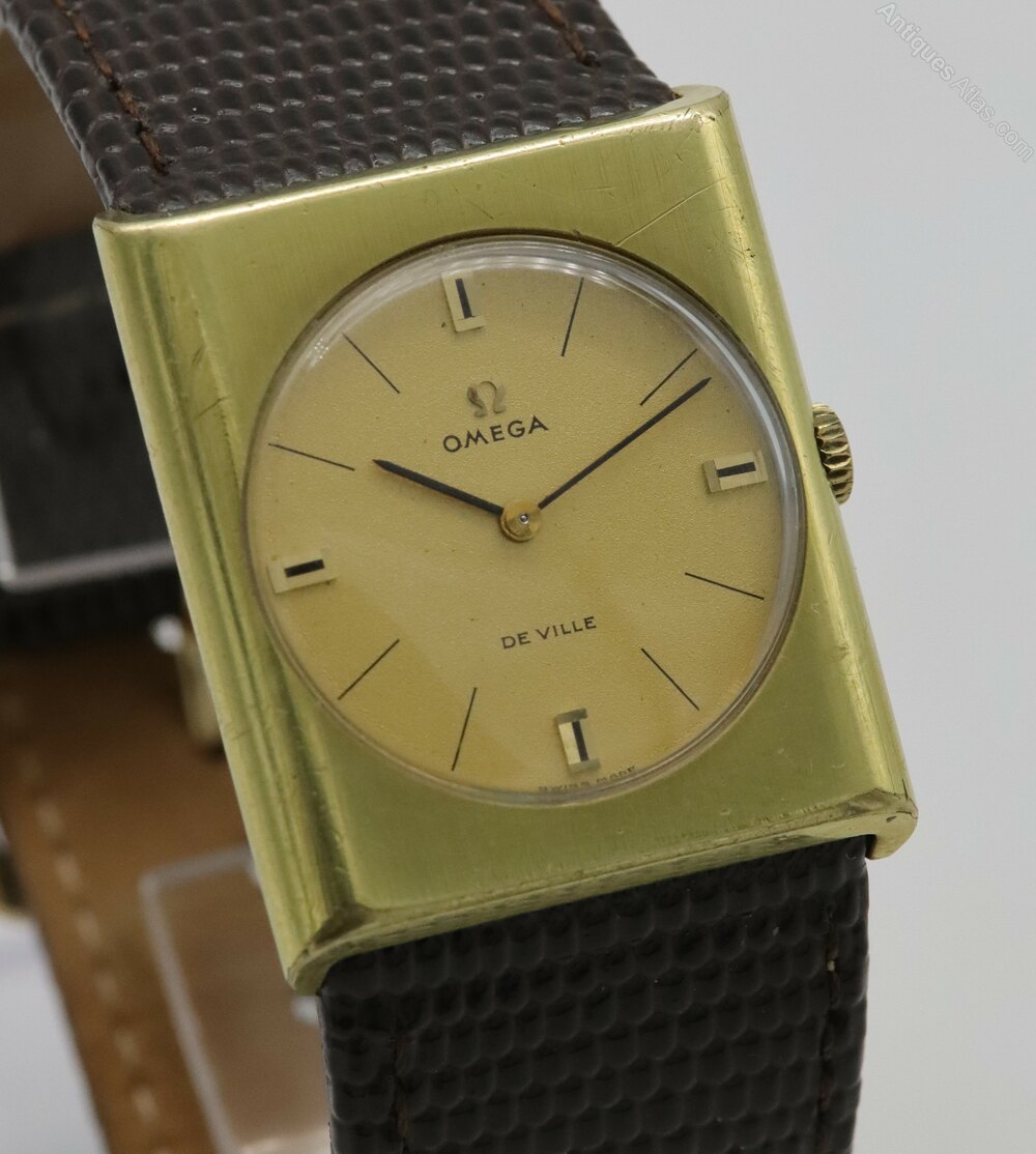 A 1972 Omega De Ville wristwatch. A gilt dial with a detailed finish, giving off a glittering effect. Slim printed hour markers of a minimalist design, matching the black 'stick' hands. Applied gilt numerals to the quarters each with faceted edges and a black central strip. An applied Omega logo to 12 o'clock.The case is of an oversized tank design, with a flat central body and lightly sloped edges. The lugs are recessed to create an integral strap design, adding to the overall 'cuff' look of the watch. Case reference 511.343. Original Omega winding crown.
