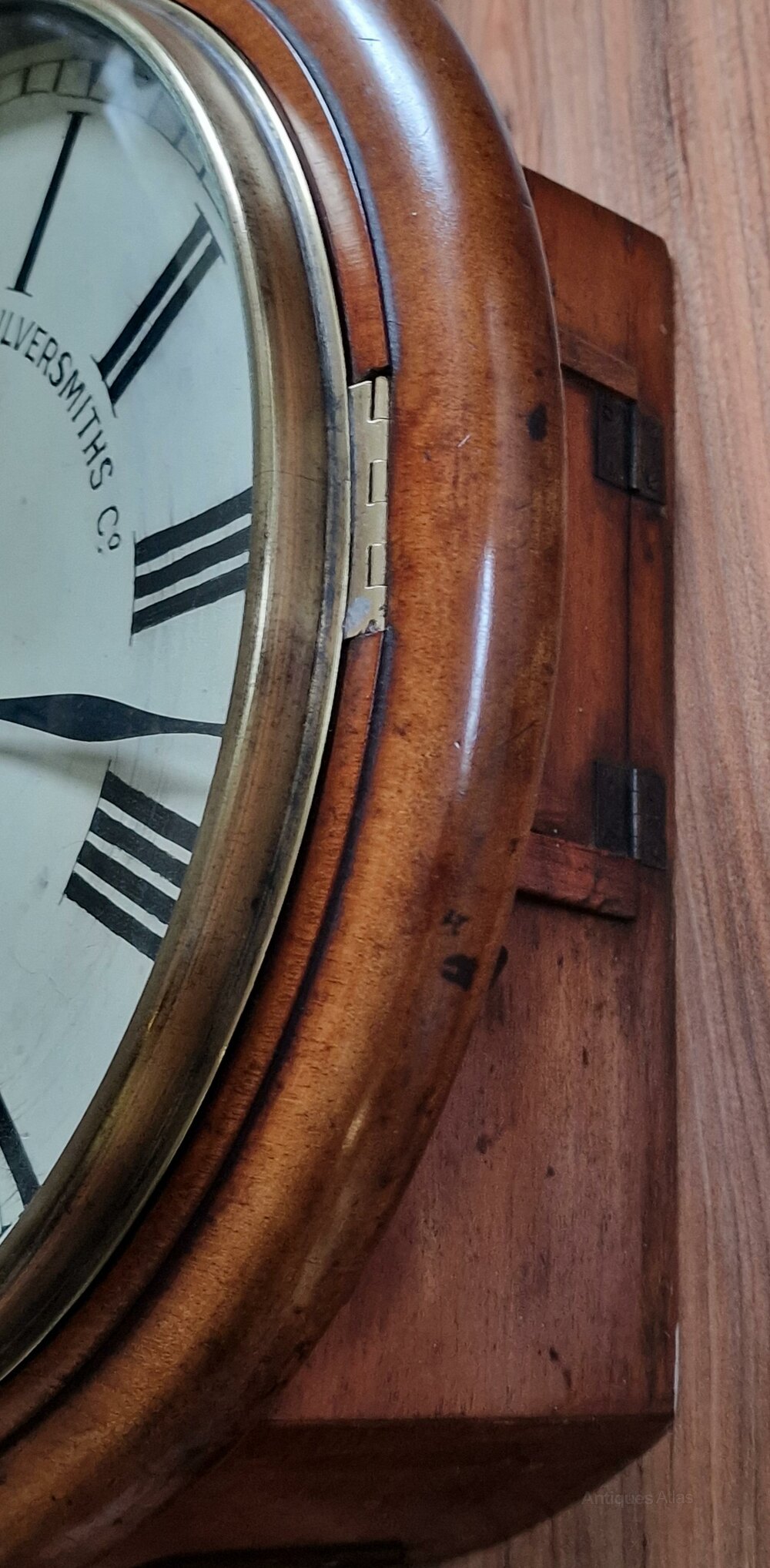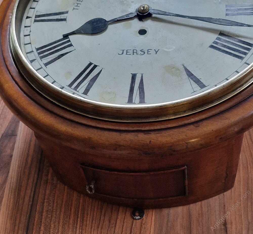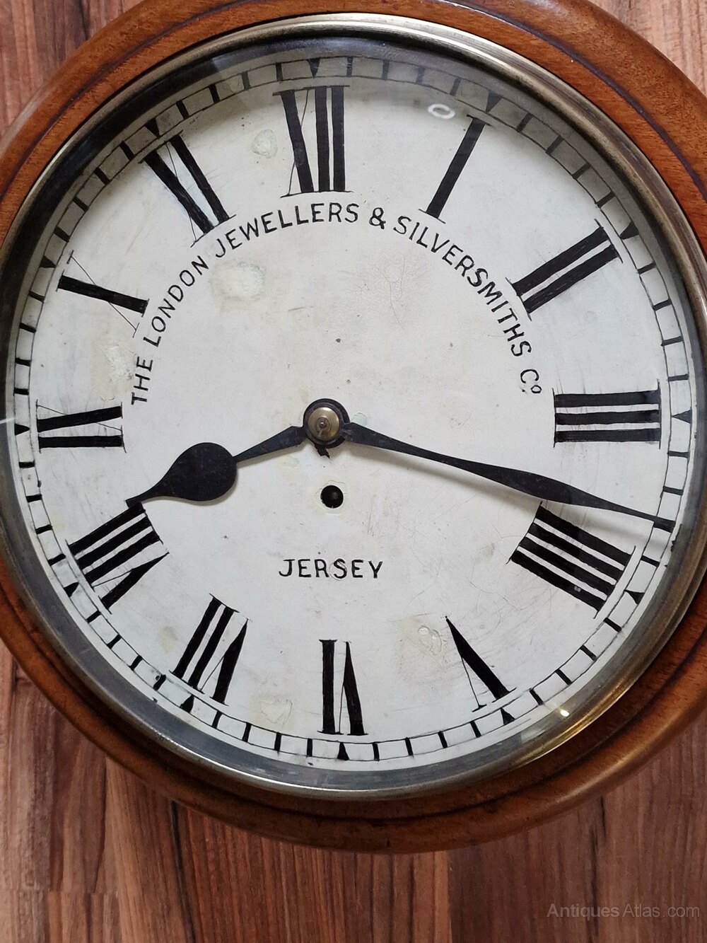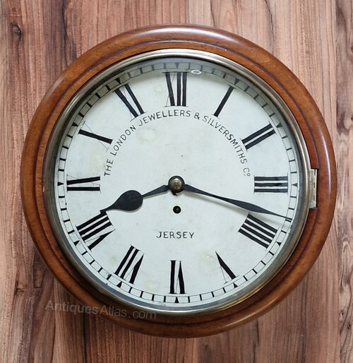A late Victorian fusee dial wall clock. A 12" painted dial signed 'THE LONDON JEWELLERS & SILVERSMITHS Co. JERSEY' with blued steel hands. A mahogany case case of light colour with a brass bezel surround and convex glass. An 8-day duration fusee timepiece mechanism. Circa 1890.Height/Width 14 1/2" / 37cms Depth 6 " / 16 cms.