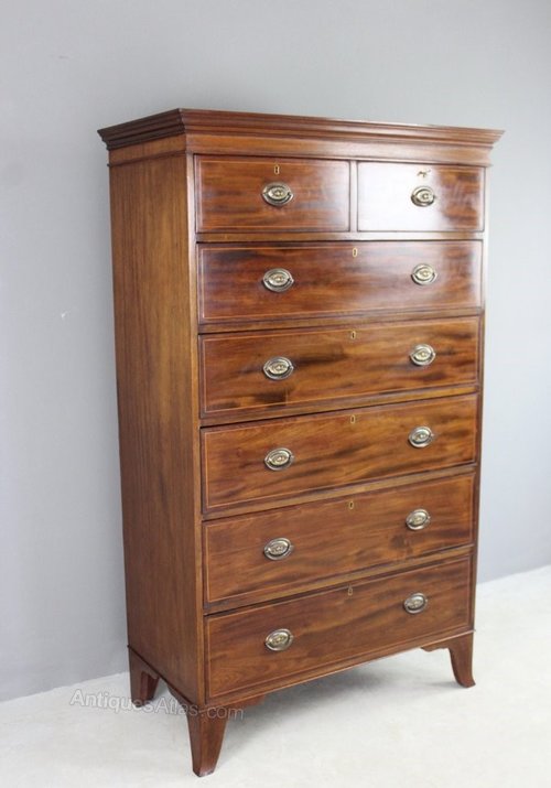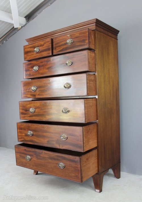 Antique style mahogany tall boy. 20th Century good quality reproduction tall boy, 2 short over 5 long drawers on small splayed legs, oval pressed handles, inlaid stringing to the drawer fronts.Dimensions: cornice : 105cm wide x 53cm deep, the body: 99cm wide x 50cm deep, 175cm high.
