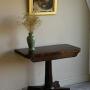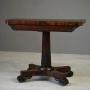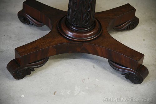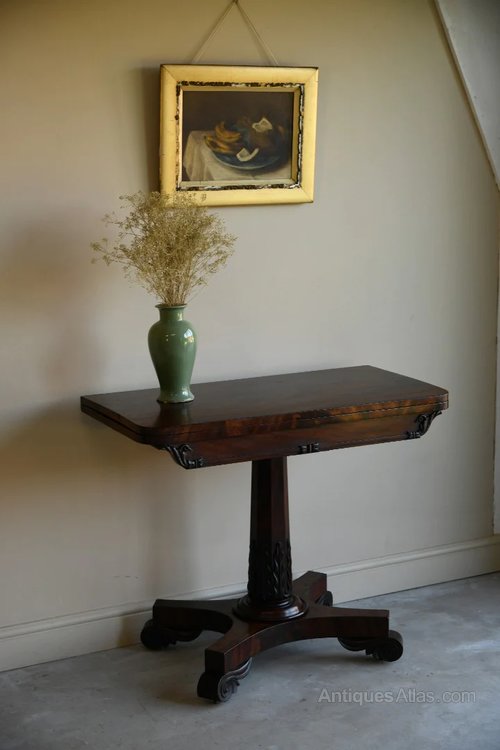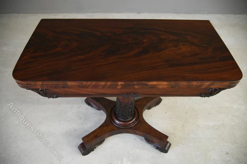 William IV Mahogany Card Table. Antique 19th Century mahogany games table, mahogany veneered turn over table with green baize lining on faceted stem with foliate carved collar on quatrefoil base and scrolled feet.Dimensions: 91cm wide x 45.5cm deep x 76cm high.