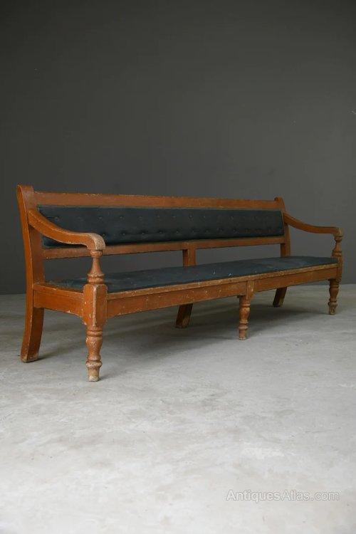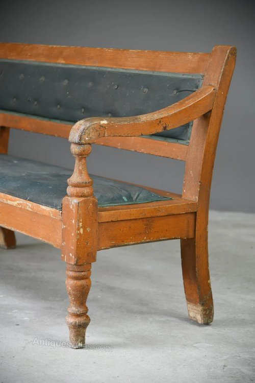 Large GWR Scumbled Pine Bench. Late 19th Century large GWR bench, original scumbled painted finish, open bar back, rexine upholstered back and seat with original stuffing, on turned legs. Stamped GWR to the underside.Dimensions: 260cm wide x 60cm deep x 50cm seat depth x 69cm arm height x 90cm high at the back.
