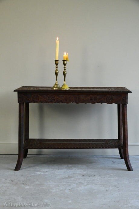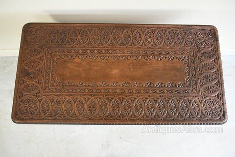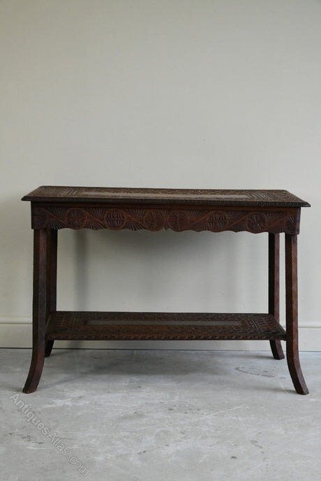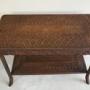 Carved Anglo Indian Occasional Table. Early 20th Century Anglo-Indian carved teak rectangular two-tier occasional table decorated with geometric shapes on square shaped legs.Dimensions: