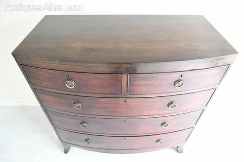 Antique Mahogany Bow Front Chest of Drawers. 19th Century dark mahogany bow front chest of drawers, two short over three long drawers on splayed legsDimensions: 106cm wide x 52cm deep x 105cm