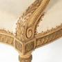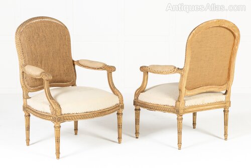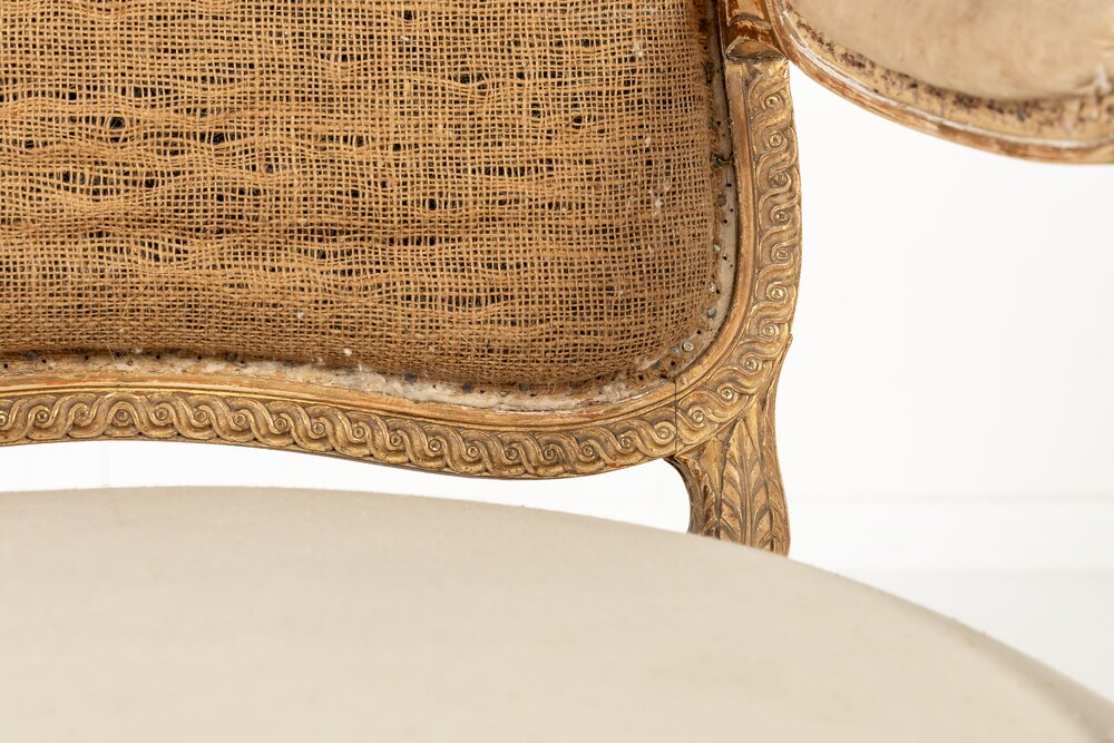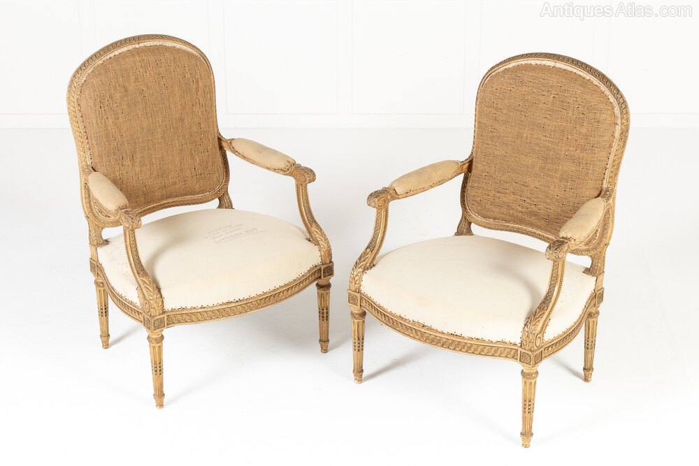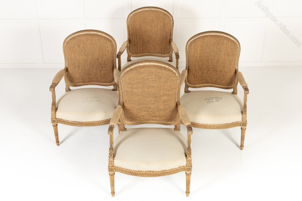 These armchairs are gilded throughout and stand on turned and carved legs with toupie feet. The show frame on the back and the front seat rails are both carved with a repeating guilloche design, the legs are fluted and have additional leaf carving where they join the front rail. There are also carved floral paterae on the blocks at this point.