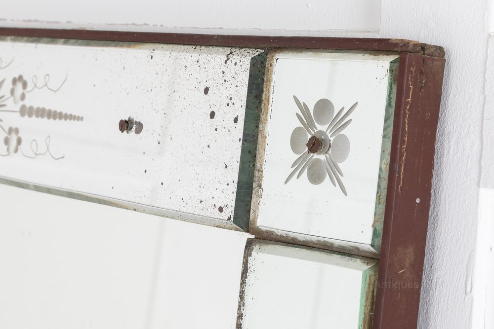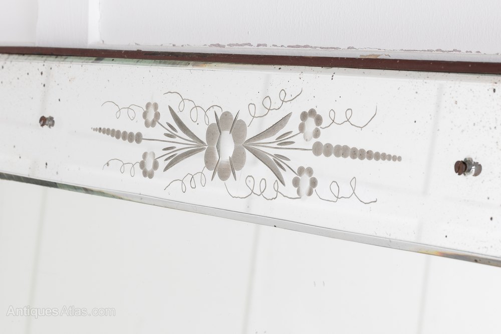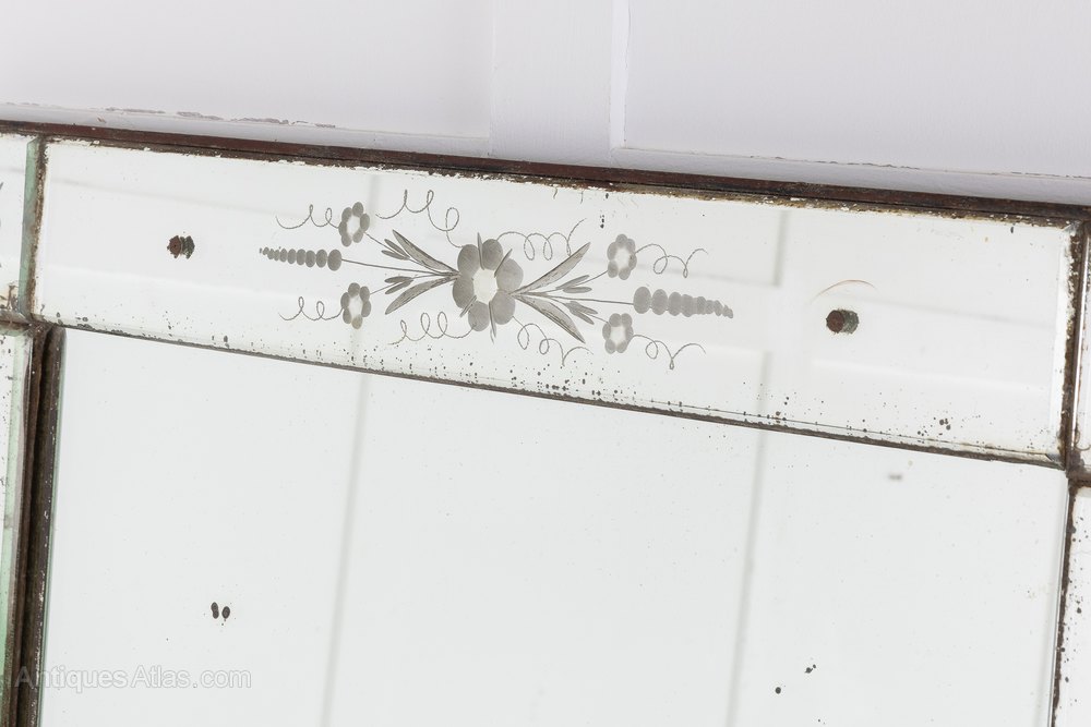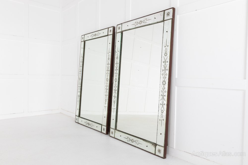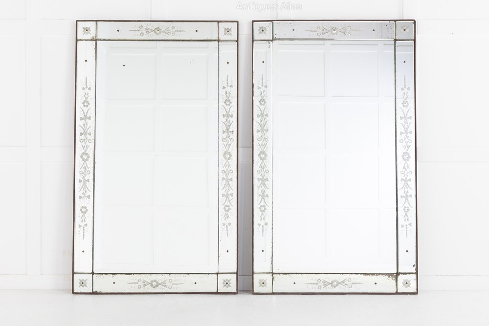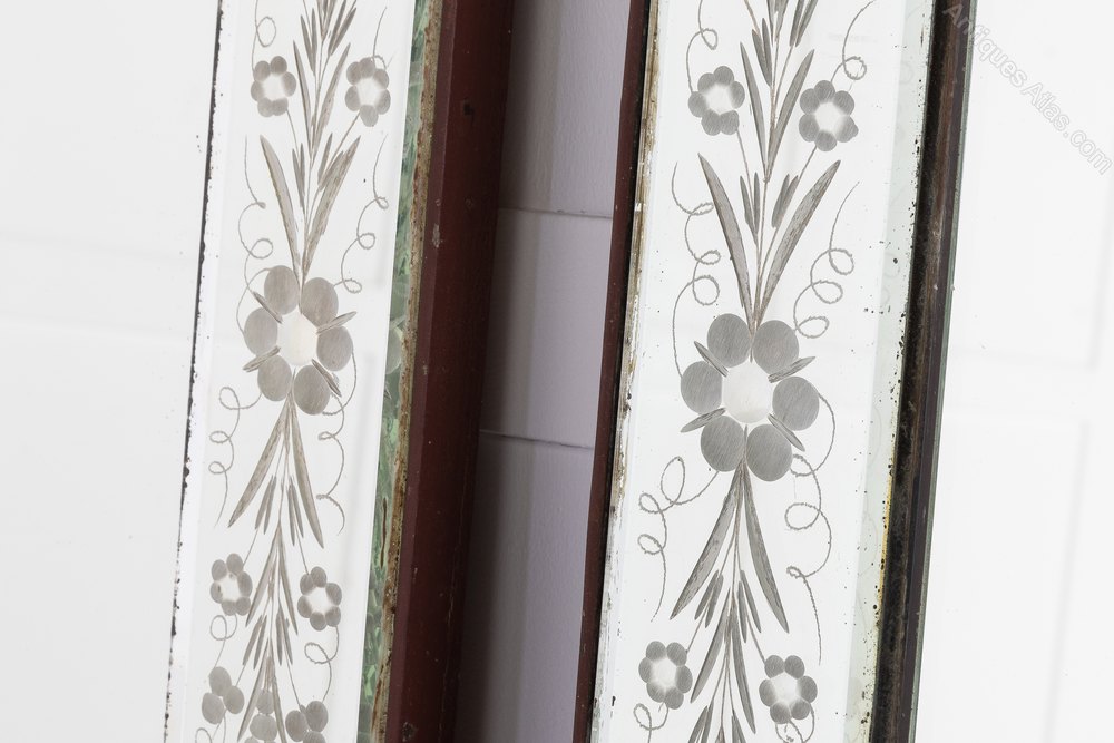 A pair of elegant, rectangular French 19th Century 'Venetian' mirrors with lovely original mirror glass. In good condition, with delicate etched floral decoration on its borders.Shipping information