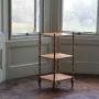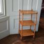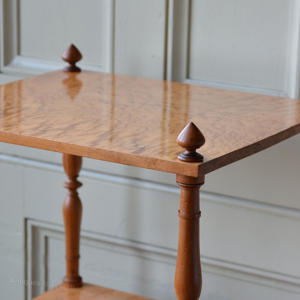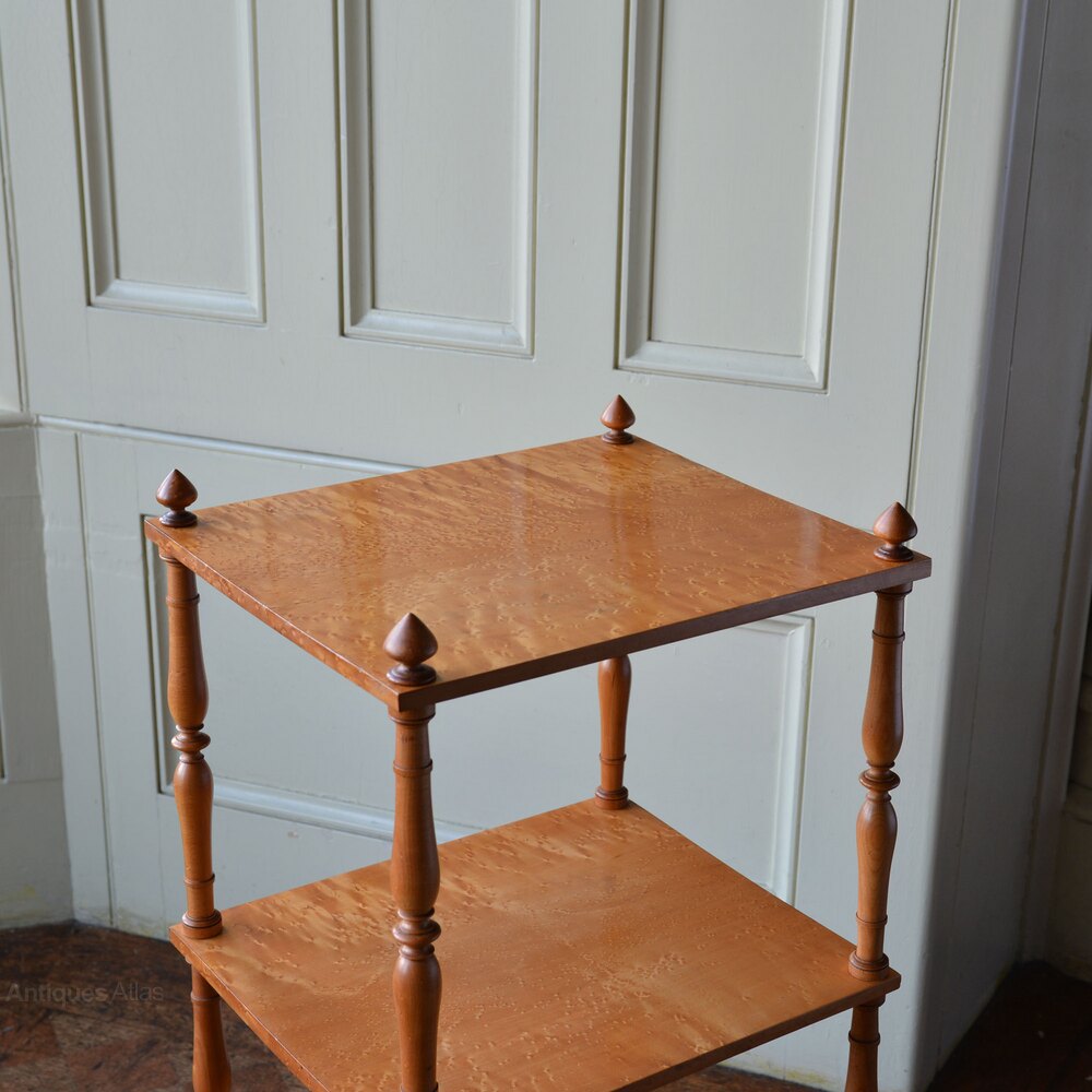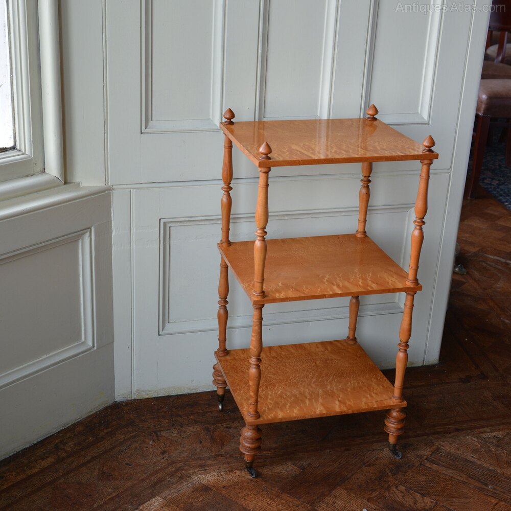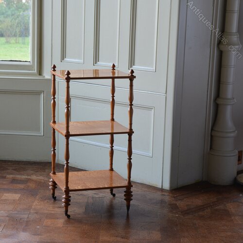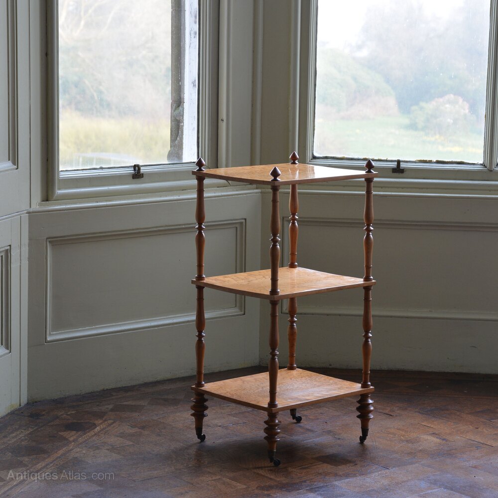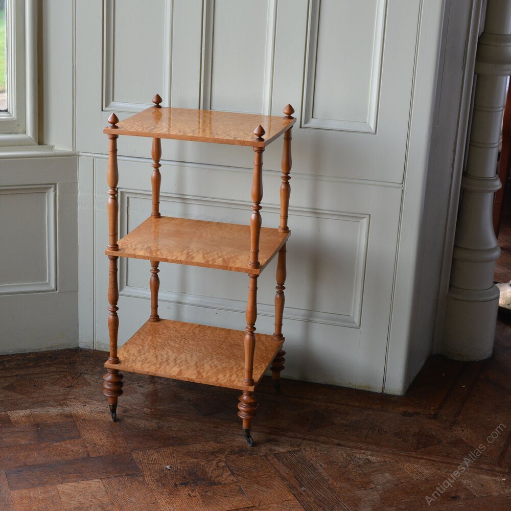 A birdseye maple whatnotThree tier whatnot or etagere, the shelves veneered in well figured birdseyes, united by well turned supports, stands on small brass castors.