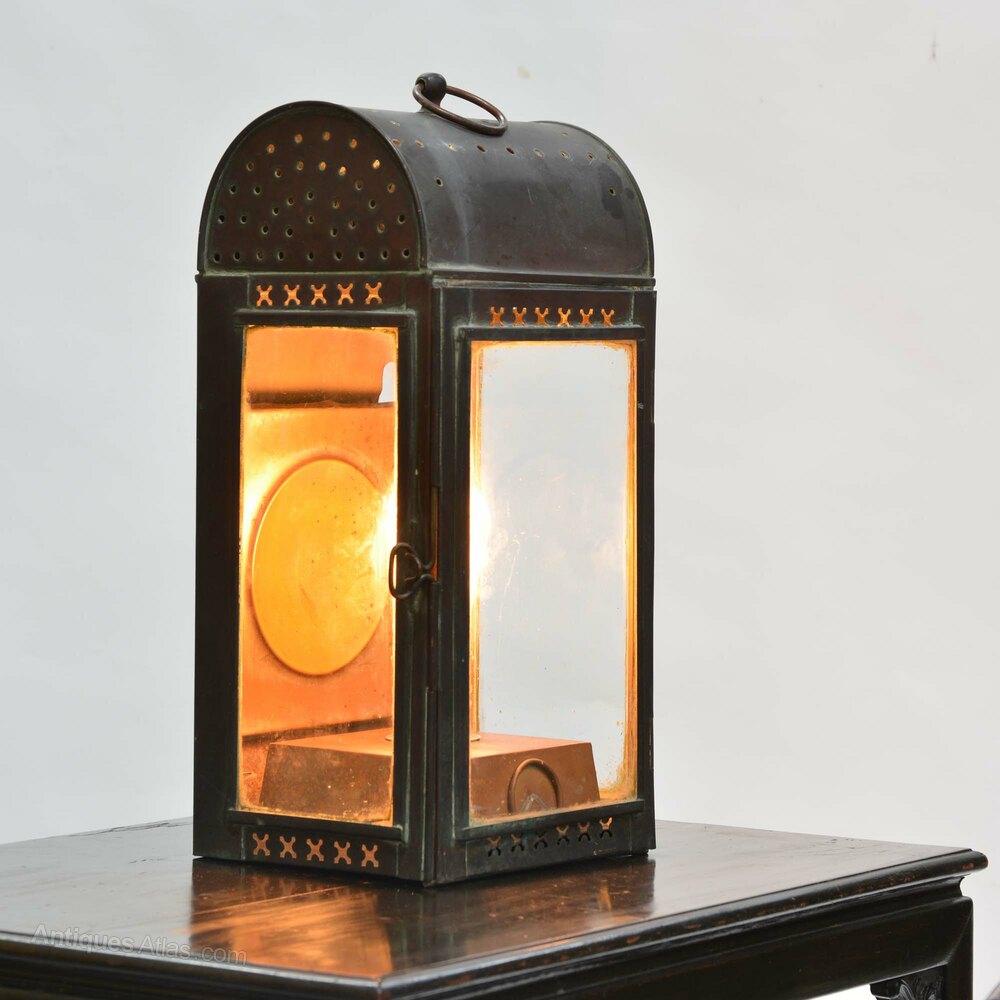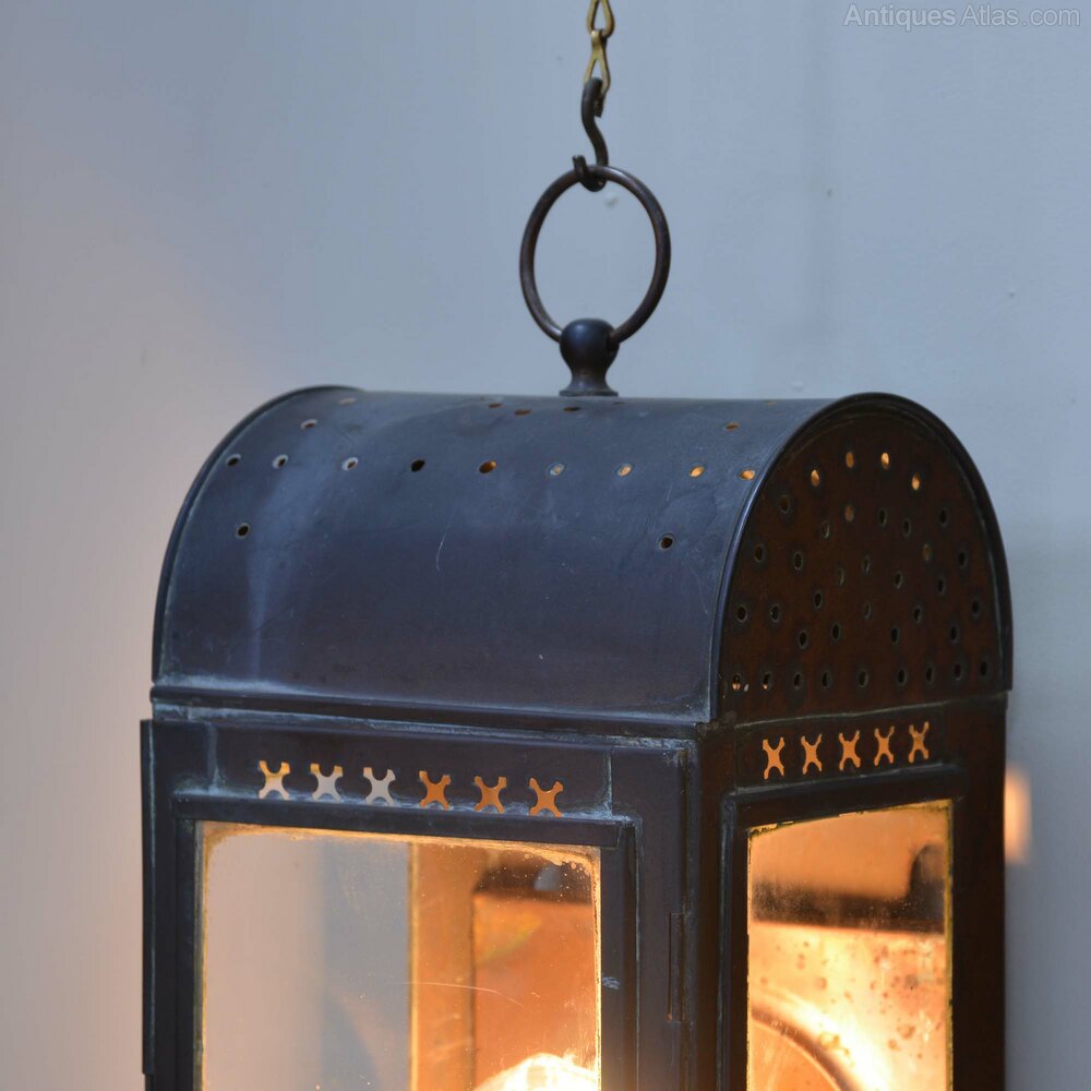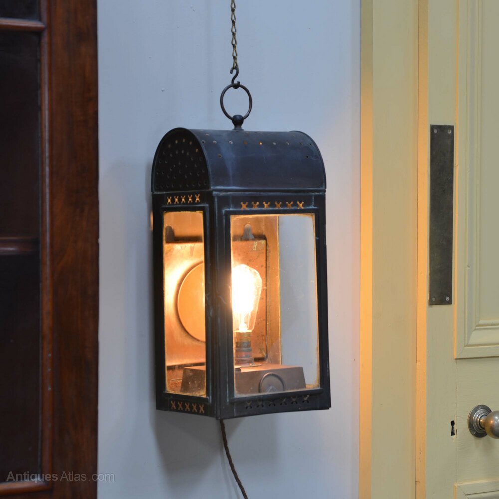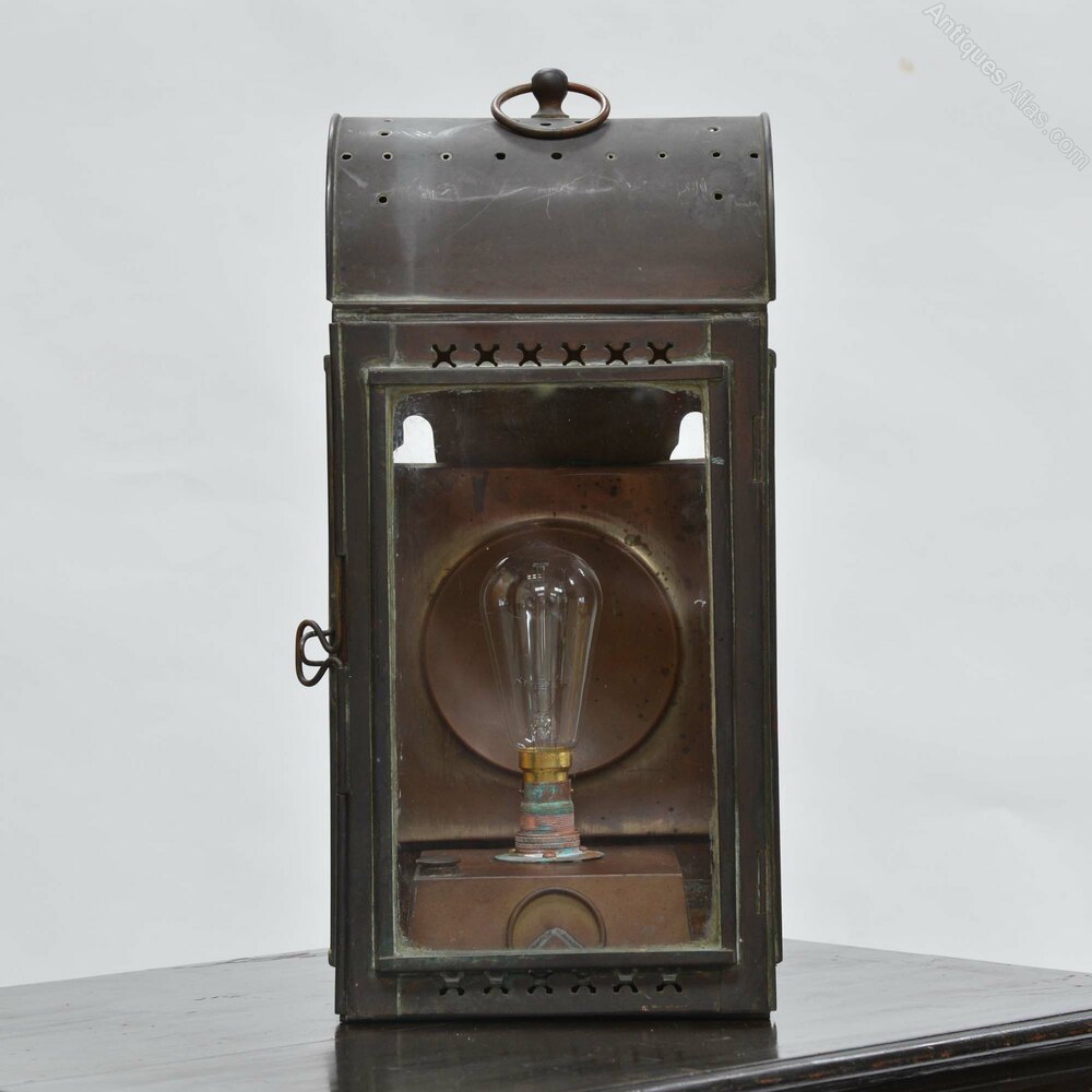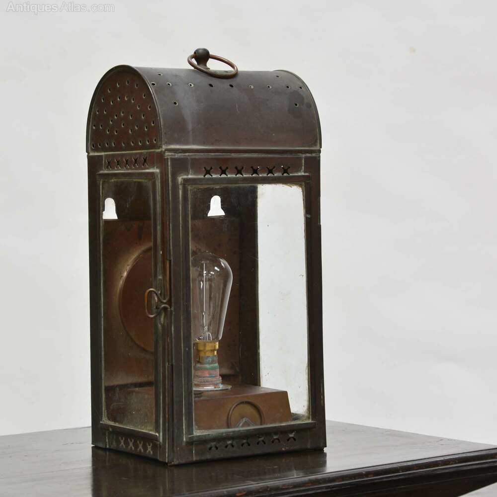 Copper wall lantern19th century aged copper lantern which can be wall mounted or hung from the loop at the top, originally an oil lamp and now converted to electricity, wired for use internally as it has holes in the top so it is not weatherproof.