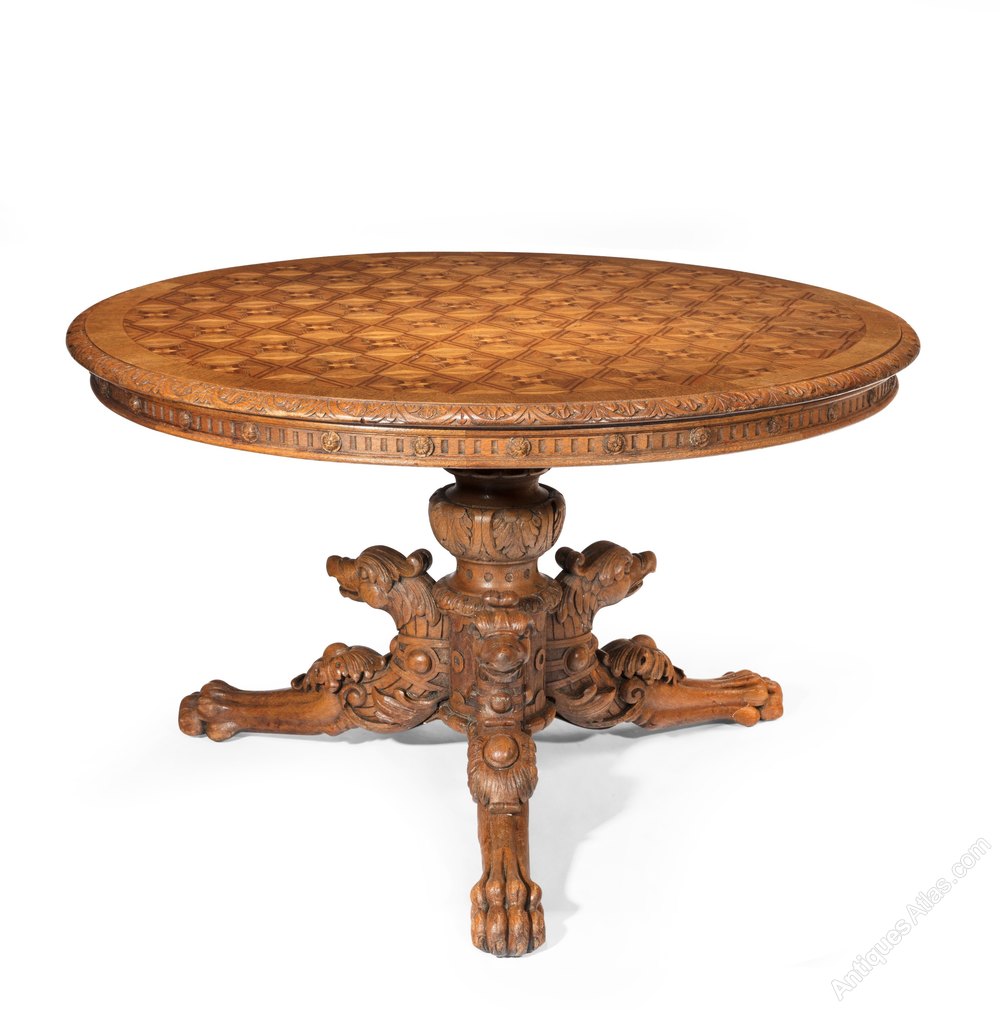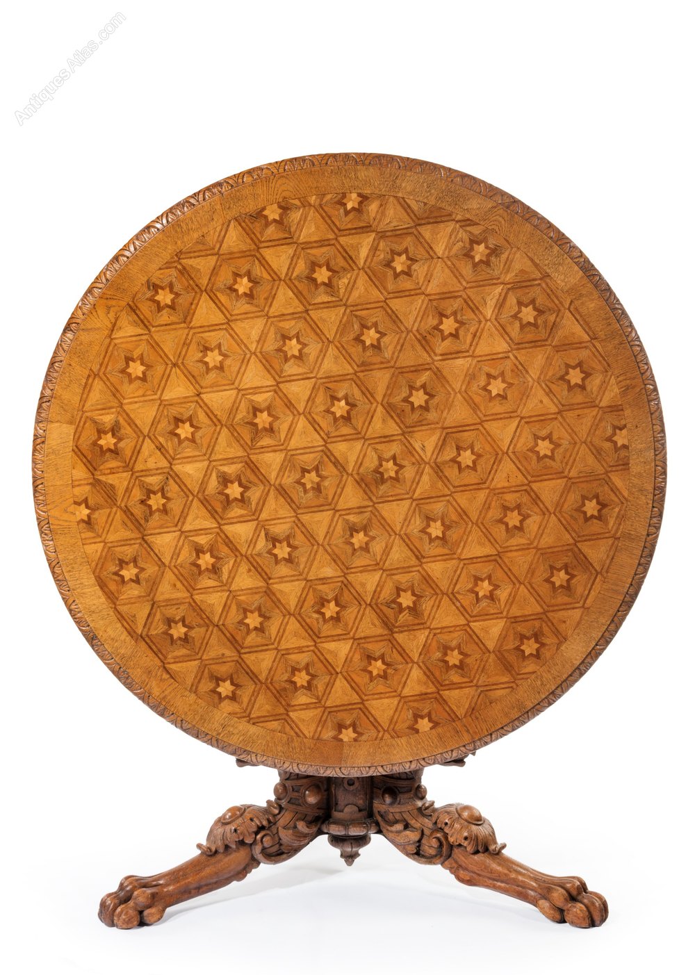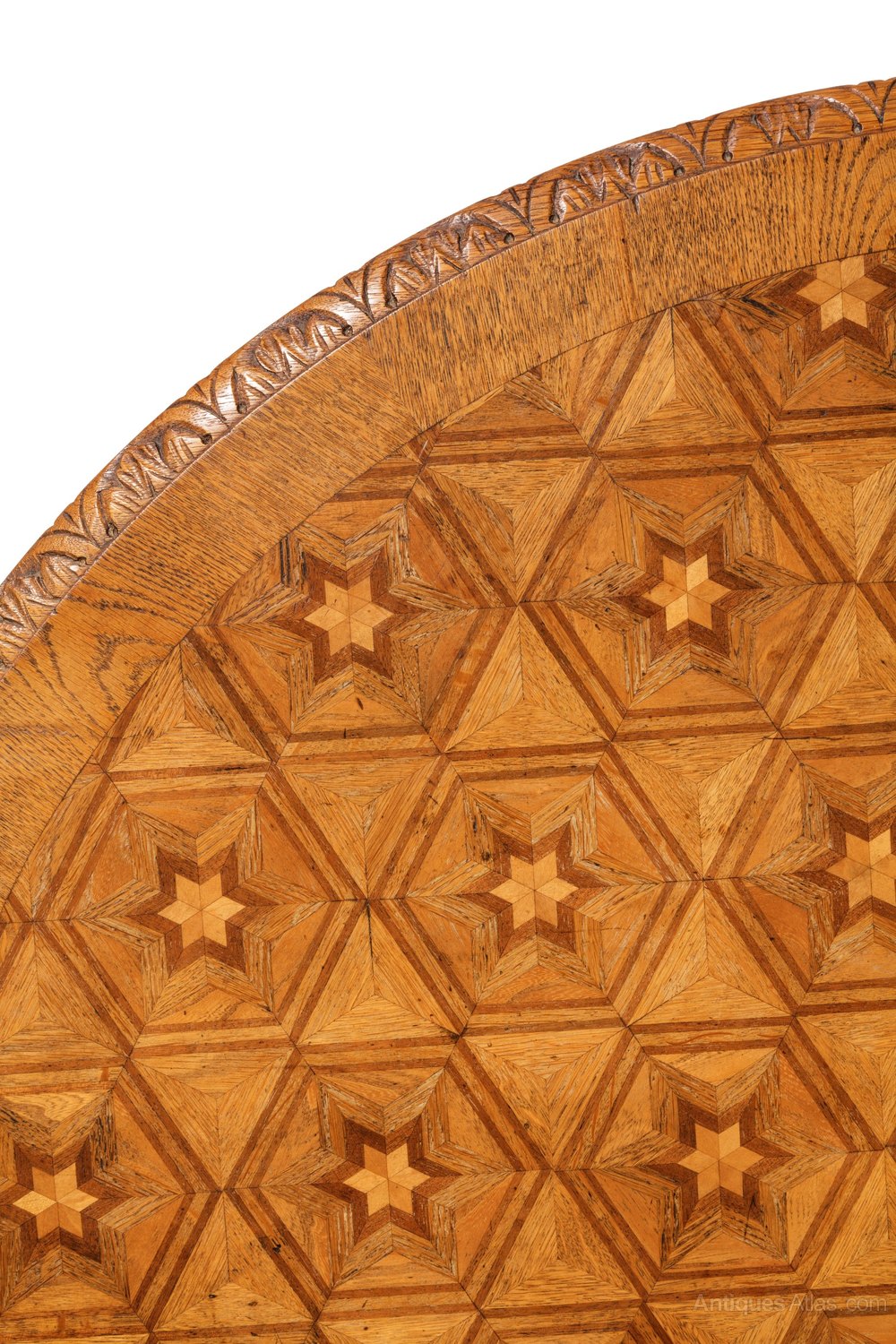 A wonderful and rare mid 19th Century circular oak parquetry inlaid tilt top table on carved griffon base.The large oak circular top being inlaid with a repeated 'trompe l'oeil' star motif with a carved foliate edge having a fluted frieze with rosettes above a carved triform pedestal base with griffon masks and terminating on lion paw feet.