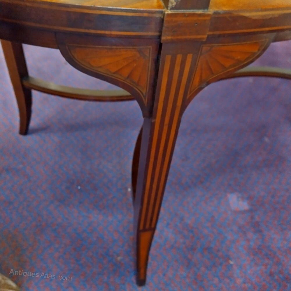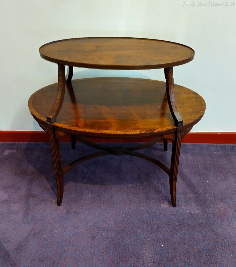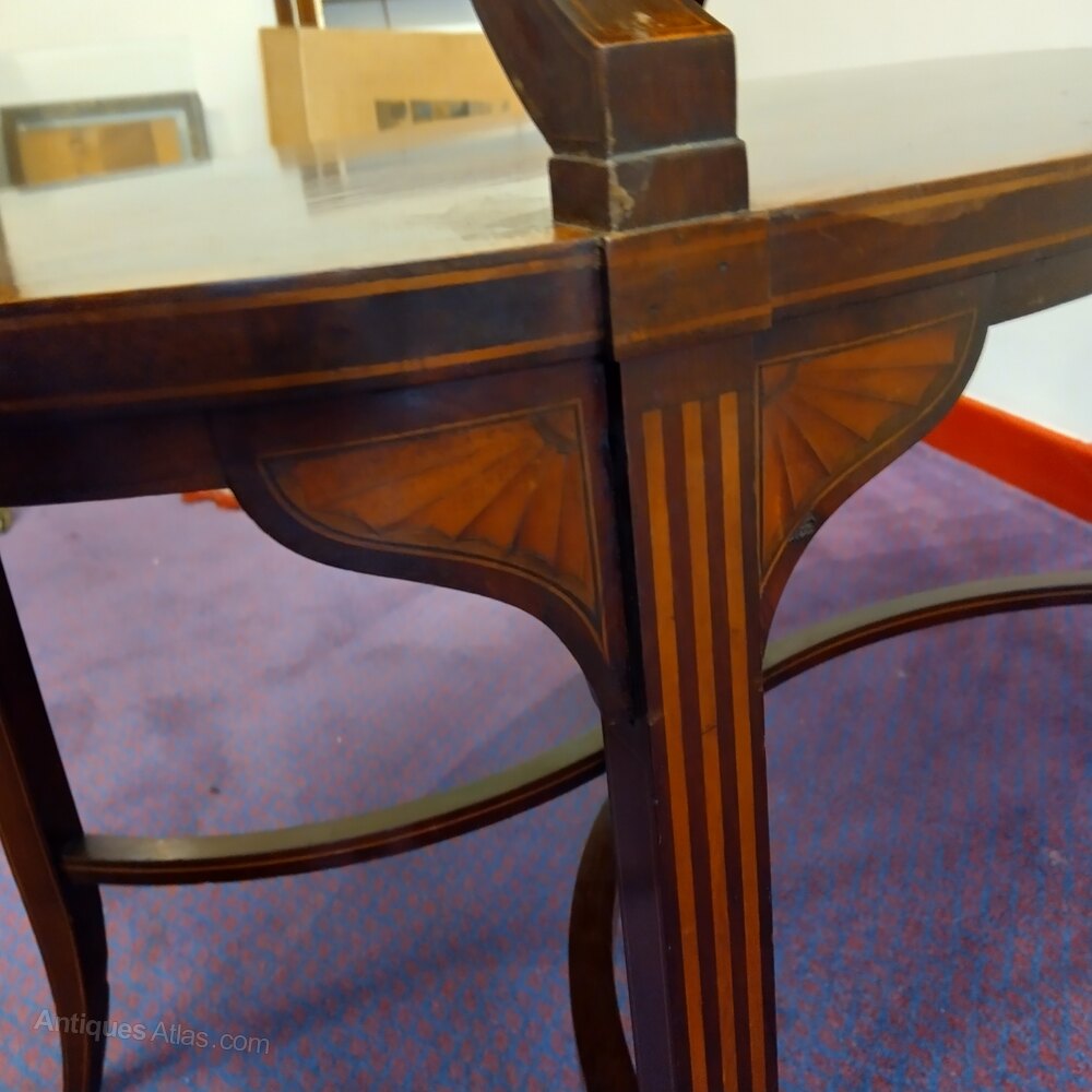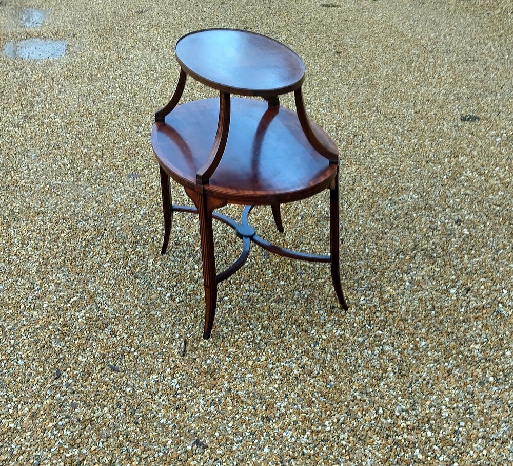 A very pretty Edwardian inlaid Mahogany occasional table with two tiers. The legs are inlaid with a fan pattern support under the lower tier. The top is inlaid around the outside edge on both levels. In nice tidy condition after a clean in our workshops and a rewaxing to enhance the grain. The legs at the bottom attached in support with the crinoline stretchers. not to be missed at this very keen price of only £385.00.We have been in business for 40 years and are now coming up to retirement. We are in consequence looking to reduce our stock, Delivery can be arranged with a specialist carrier for around £70 to most areas. We now open by appointment, but we are often open Fridays and Saturdays, but cannot guarantee,( our sign will be out if passing ) it is worth ringing before coming.Tel 01565 874075