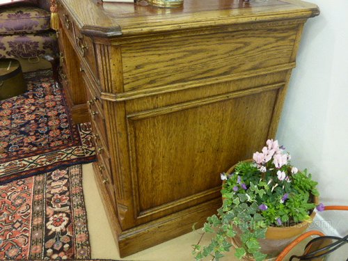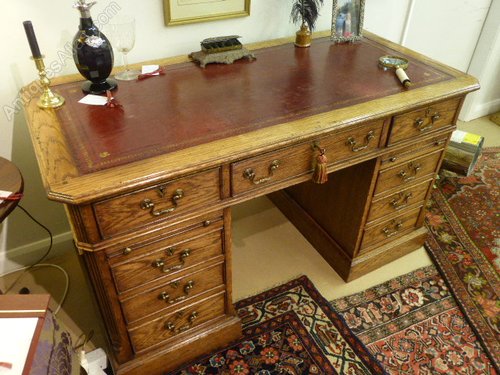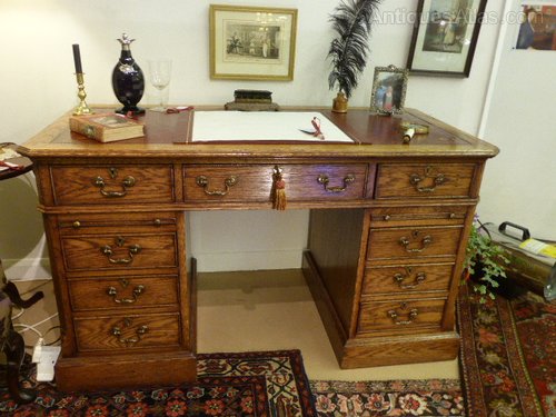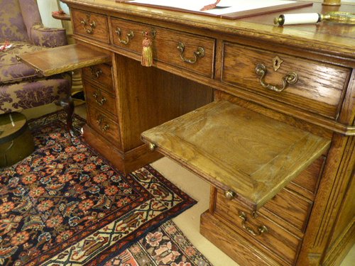 Handsome Oak Desk in excellent condition with 4 drawers to each pedestal and a central drawer, 9 drawers in total. It has a sliding for resting papers to each side (see pictures) an unusual feature. The desk could stand in the centre of the room as it has dummy drawers to the reverse side of the desk.It is made in solid oak with mahogany linings and is extremely heavy with solid construction