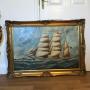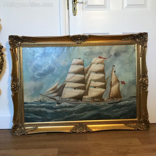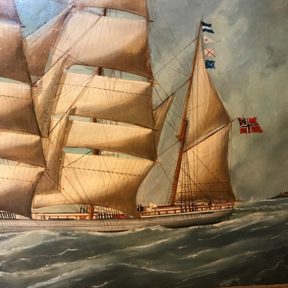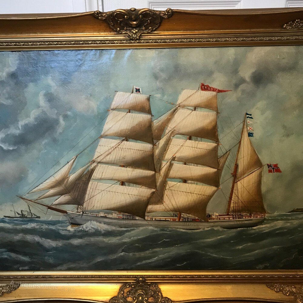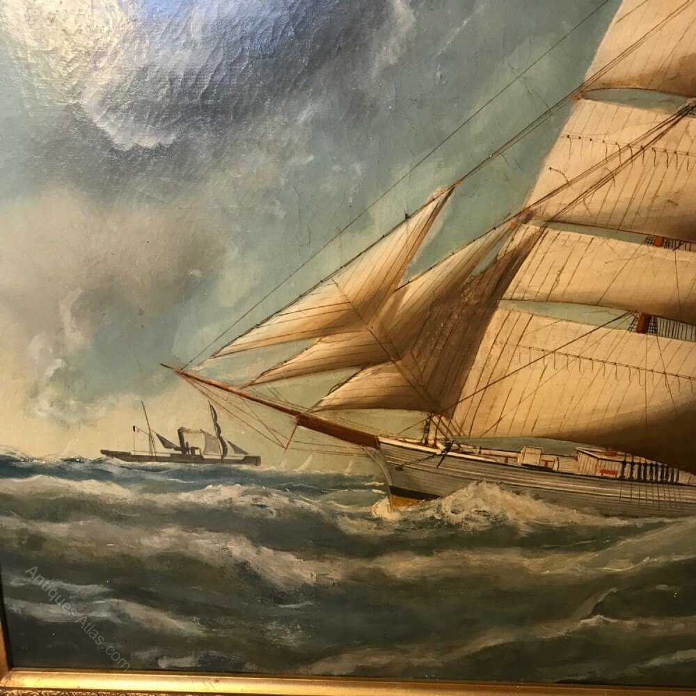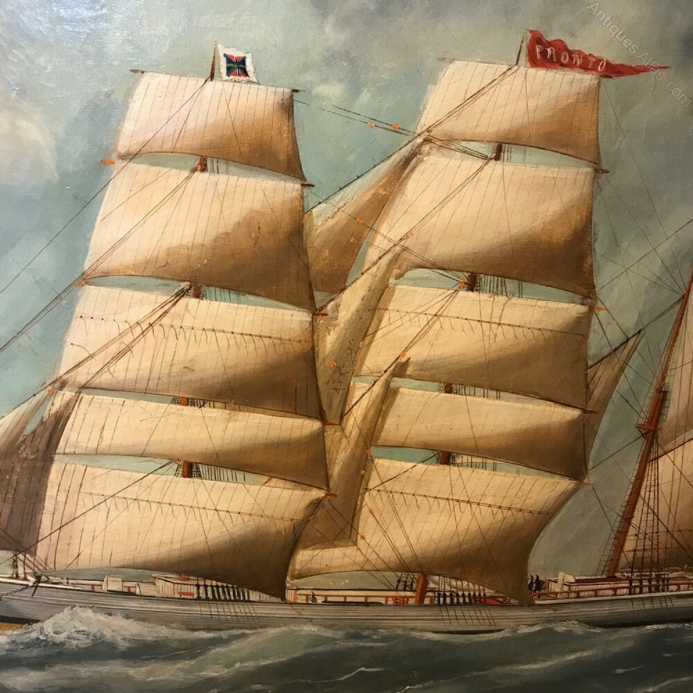 Large Late 19th Century Oil Painting on Canvas of The Three Masted Vessel named PRONTO.This historically important painting is the only known surviving example painted shortly after the vessels construction in 1892 and sometime before its demise after running ashore in bad weather and becoming a ship wreck thereafter in 1895