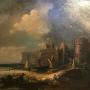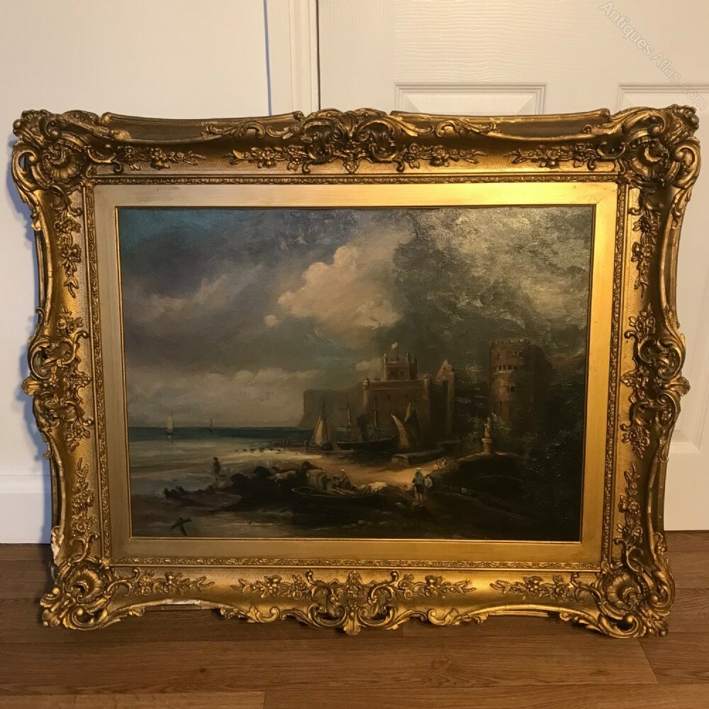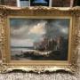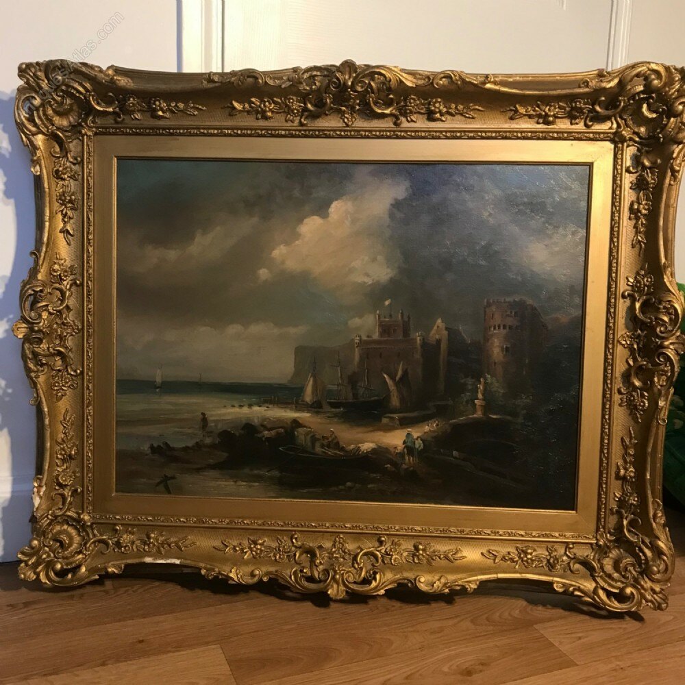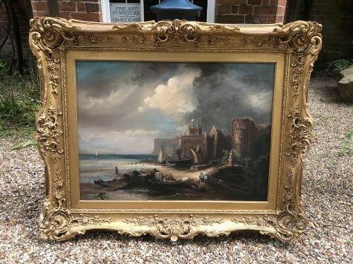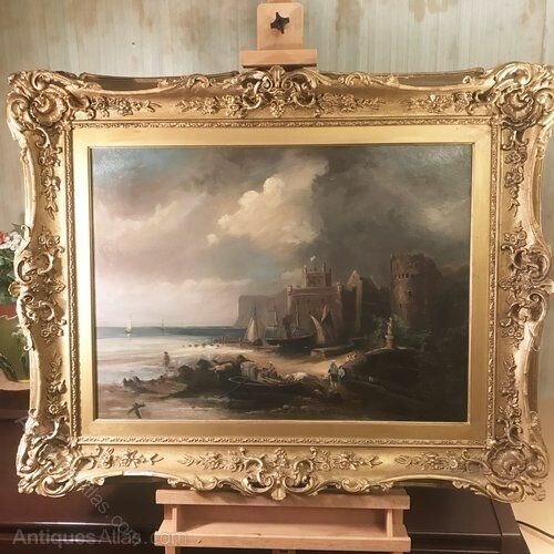Dutch Manner Oil Painting On Canvas Circa around 1860 in very large decorative frame.Depicting a Castle Turret and Fortress on the shoreline, with fishing vessels on the sandy beach head front with figures.