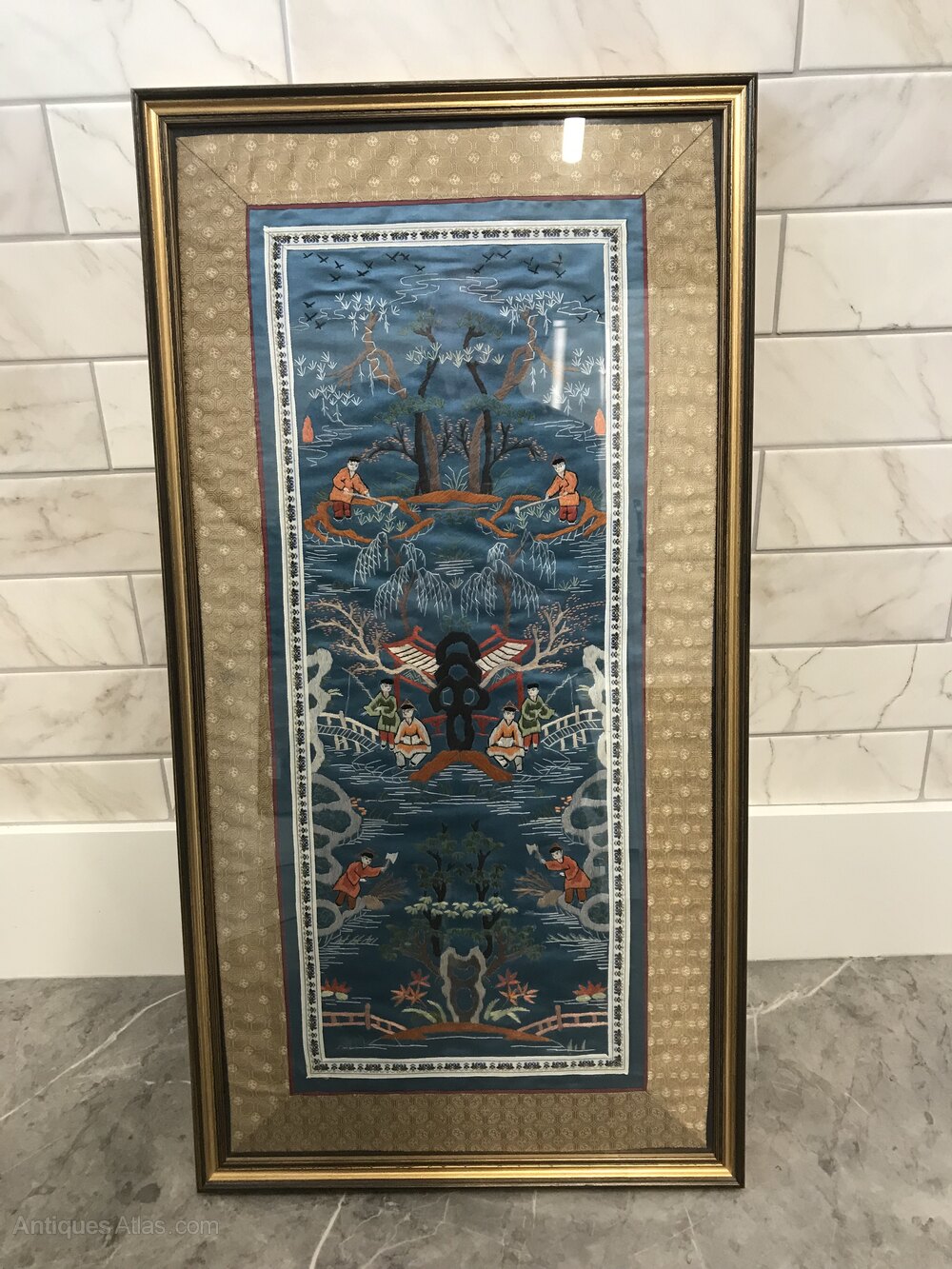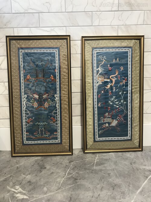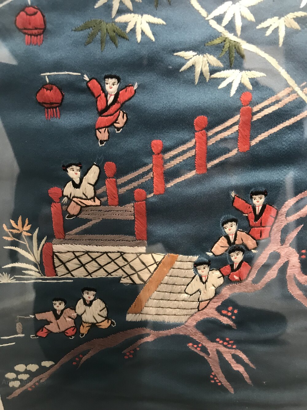 Pair of Large Chineses Silk Hand Embroidered Panels Under Glass With Decorative Bordering.Finished in a rich electric blue base panel and sewn with figures and flowers amongst trees and bridges.