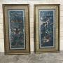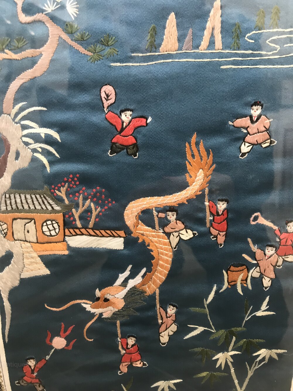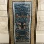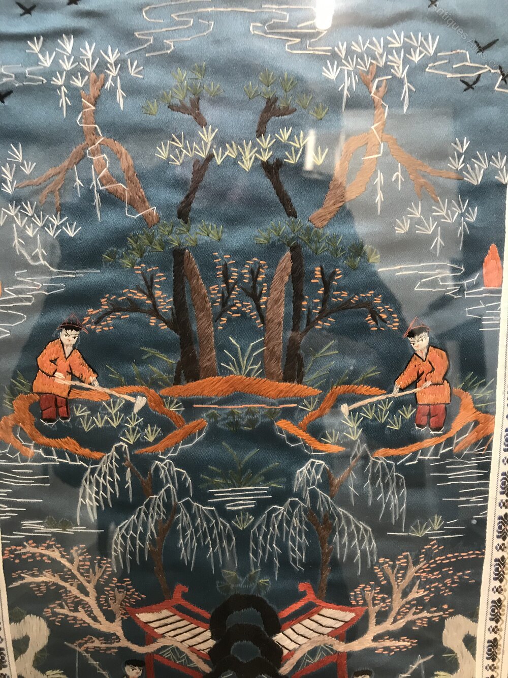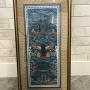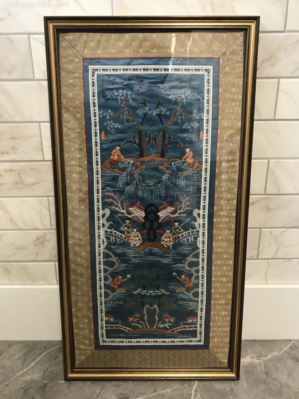 Pair of Large Chineses Silk Hand Embroidered Panels Under Glass With Decorative Bordering.Finished in a rich electric blue base panel and sewn with figures and flowers amongst trees and bridges.