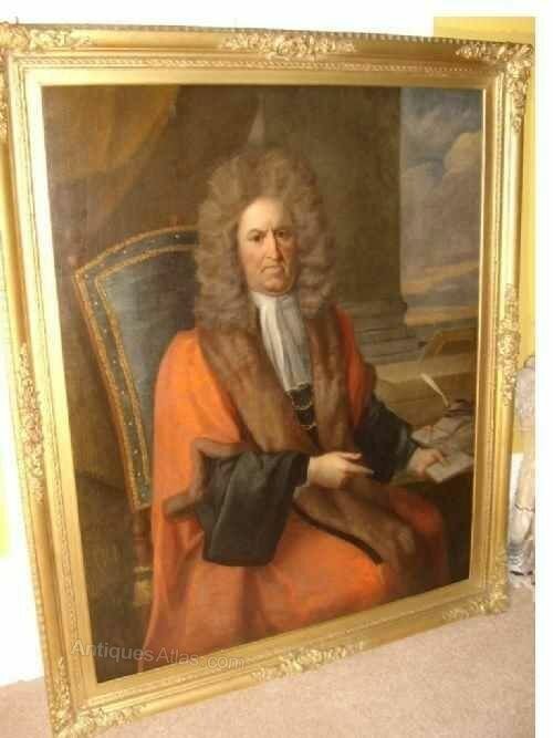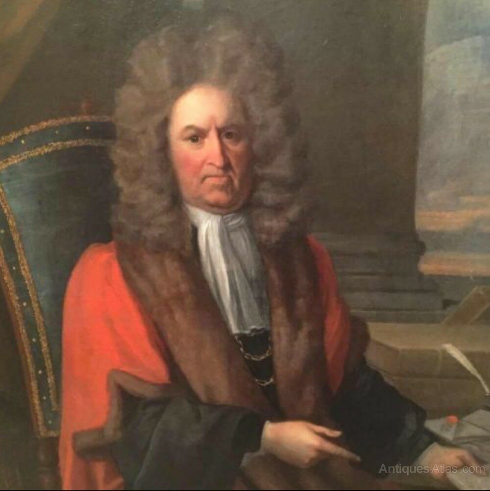 Judge Robert Dormer Mp By Thomas Hill / Large Oil on Canvas 57 X 48 InchesA fine oil on canvas portrait of Sir Robert Dormer MP. ( born 1650 - died 1726 )