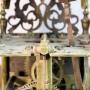 The 30 hour duration movement converted from Verge to Anchor Recoil escapement and long pendulum. Countwheel striking the hours on a large top-mounted cast bell that is hung from a sprung, attractive, crossed bell strap with an ornate centre and set within the 4 top finials.