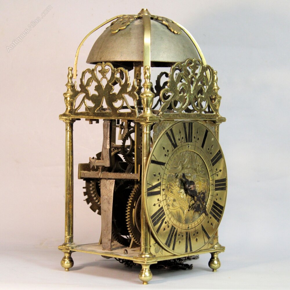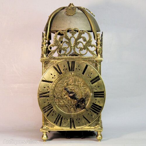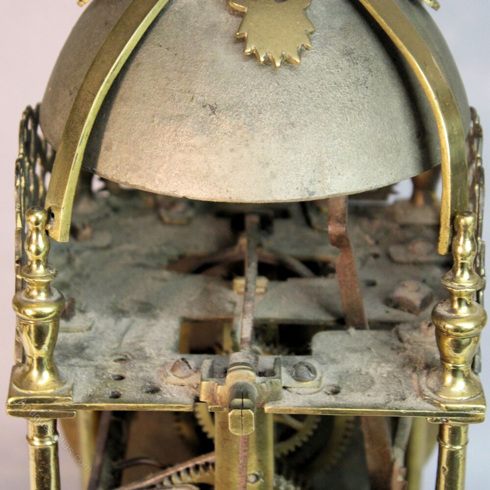 ConditionThe case is polished and lacquered but the movement is dusty and dirty. The side doors, iron backplate, hoop, spikes, pendulum, weight and top finial are missing, probably due to a historic fall from the wall (it is estimated that 99% of English lantern clocks have fallen from the wall). The escapement has been converted for greater accuracy from Verge to long pendulum Anchor Recoil and the going train has 2 replaced pinions. Prolonged use throughout its life is evident. The hammer strap has a notch to prevent it hitting the shaped pallet arbor and 6 top screws have been replaced. Following extensive examination by me the movement appears that with a simple clean, lubrication and reinstatement of the pendulum and weight, it will be in working order.
