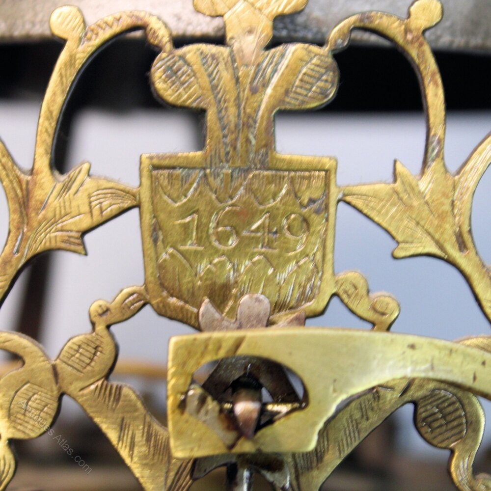 ConditionThe movement is dusty and dirty but in working condition. It has historically been fully maintained and shows very little signs of wear. The winding sprockets have been adapted for longer duration and have the Huygens \'endless cord\' method of winding. The escapement has been converted from balance wheel. The alarum work appears to have been re-instated in the Dutch style. The frets are replacements, the front of which would have carried the maker\'s name the change was probably due to the owners being Loyalists and in silent protest to the execution of the king (dated on the front fret). The doors have been repaired because the tabs have been broken off (usually caused by falling from the wall). The hanging hoop is a replacement and the spikes have broken away from the iron backplate and are missing also, the rope holes in the bottom plate have been elongated to allow the rope to run on different diameter sprockets. The lower plate also has a small square hole to the right side which I cannot explain. The clock shows obvious signs of damage from a fall (as do 99% of lantern clocks) but is running beautifully upon one of our handmade oak wall brackets.