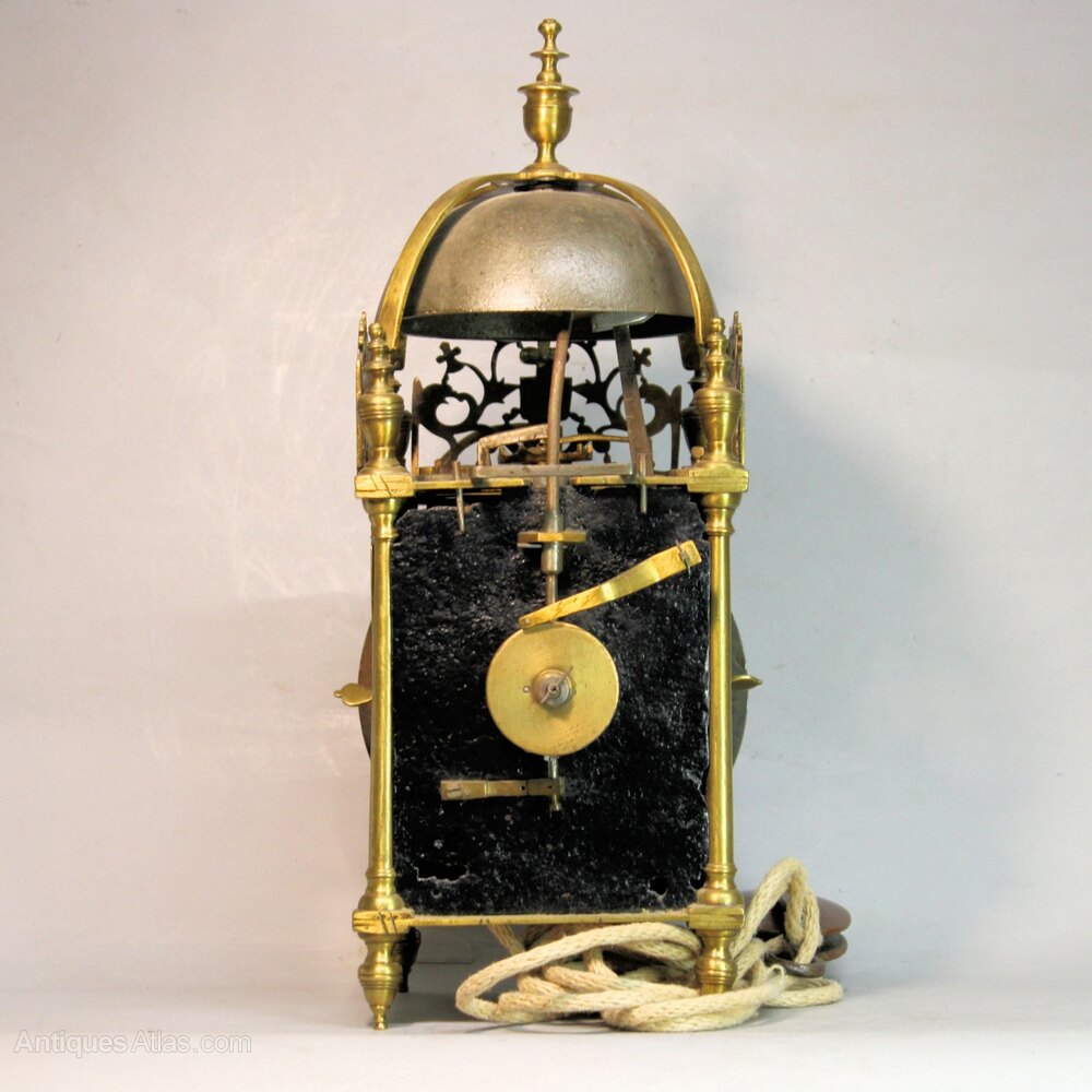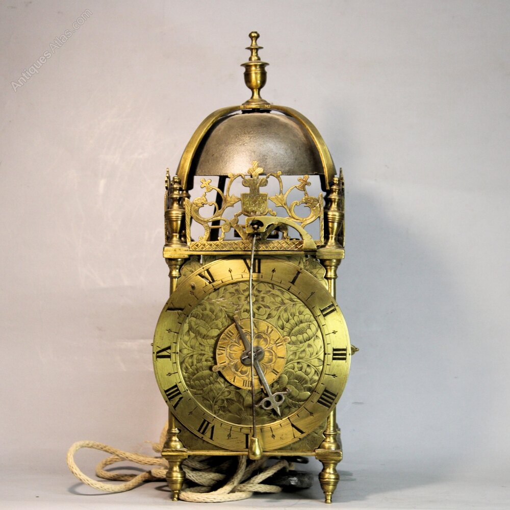 An attractive example of a very early Lantern clock.The originally of short duration, rope driven, seperately wound trains movement with Verge escapement and rare, front-mounted, short 'cow tail' pendulum. Countwheel striking the hours on the top-mounted bell that is square pegged and underslung from the crossed carrier that is sprung within the finials. The front and rear mounted wheel trains are pivoted within the usual 3, upright, flat pillars that are located and wedge-fitted between the square top and bottom plates. The movement also has alarum work that is fitted to the outside of the iron backplate and the pallet arbor front rolls on a 'knife edge' and has a decorative pendulum rod top.