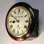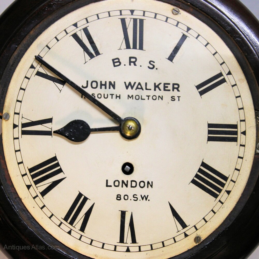 Behind an 8" diameter, flat painted iron dial with its original paintwork. Having an outer, divided minute track with triangular hour markings, inner, Roman hour numerals and the centre being written with "B. R. S. (brackets removed from the "S" but can still be seen if closely looked at) JOHN WALKER, 1 SOUTH MOLTON ST." above the centre and "LONDON 80 S.W." below the centre. The paired steel hands are painted black and are behind a hinged and glazed spun brass bezel and sight ring.