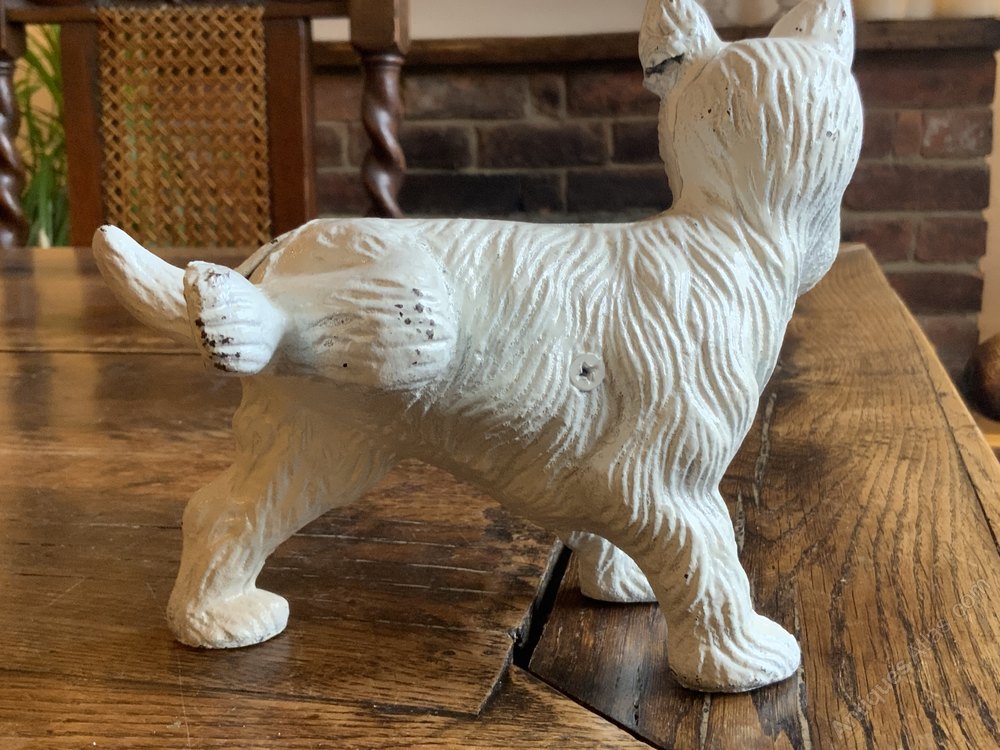 Lovely Vintage Cast Iron Doorstop of a White Scottie Dog (cocking his leg)Heavy door stop really cute little sculpted dog