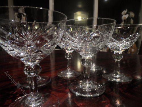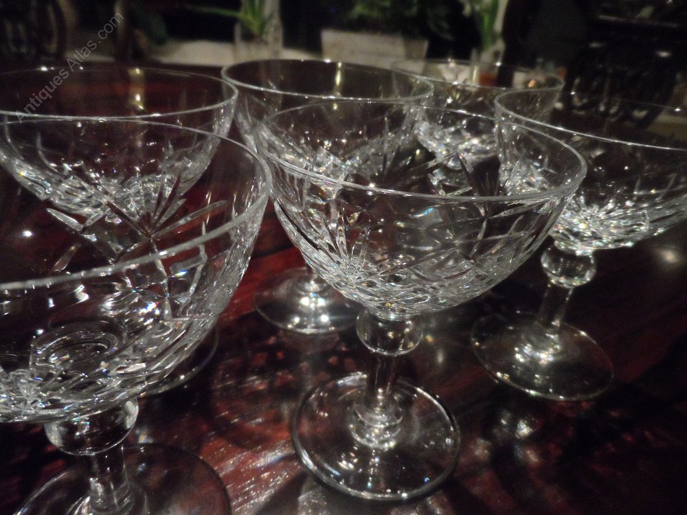 Superb set of six coupe champagne glasses.Vintage in super condition. Lovely cut glass bodys standing on a pedestal with a globular top and clear base.