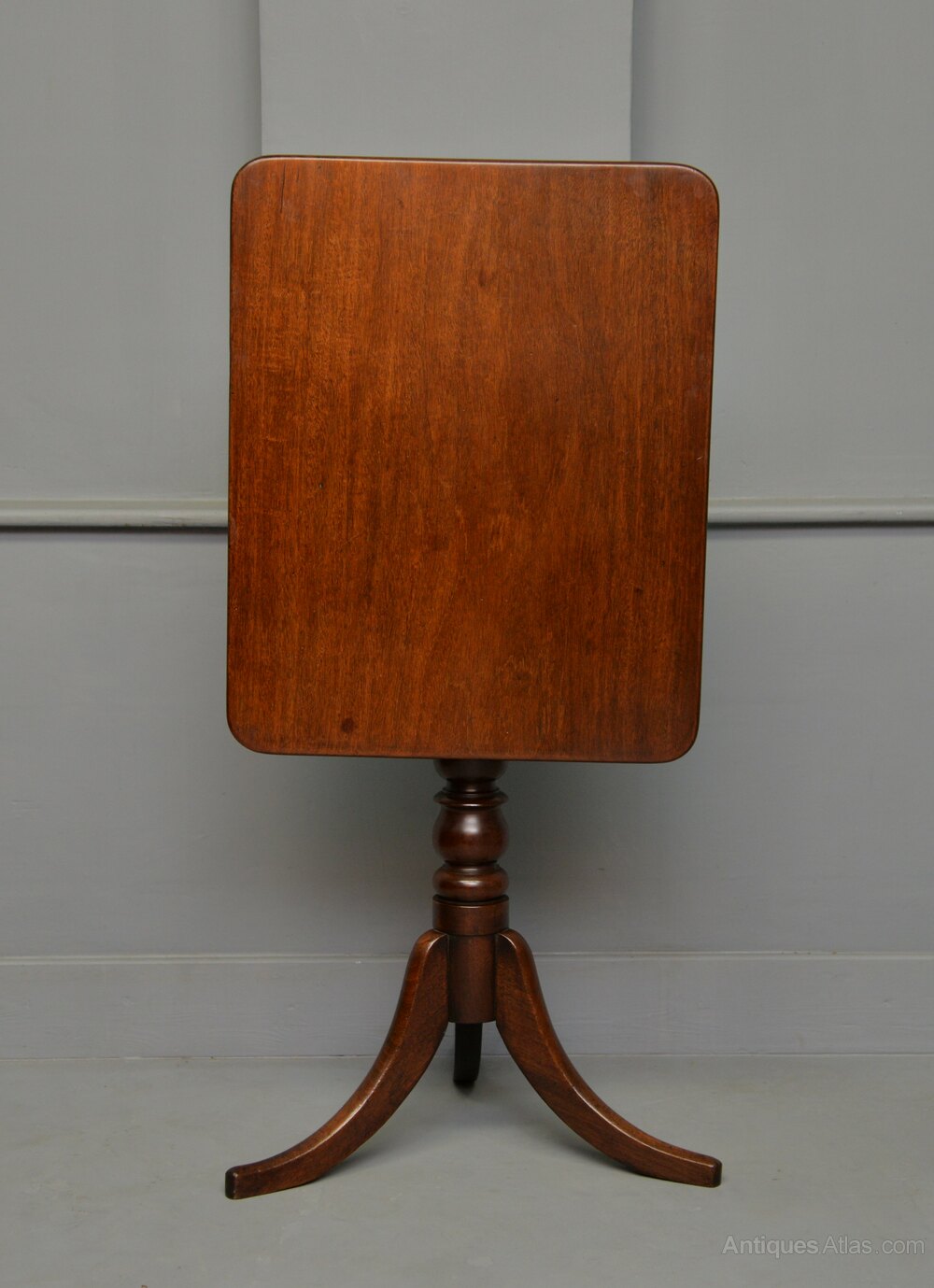 The solid mahogany table with a rectangular shaped tilt-top, is supported by an elegant turned baluster shaped pedestal, with tripod sabre supports.
