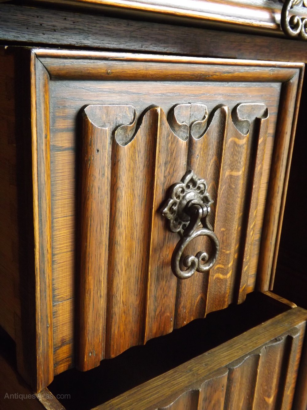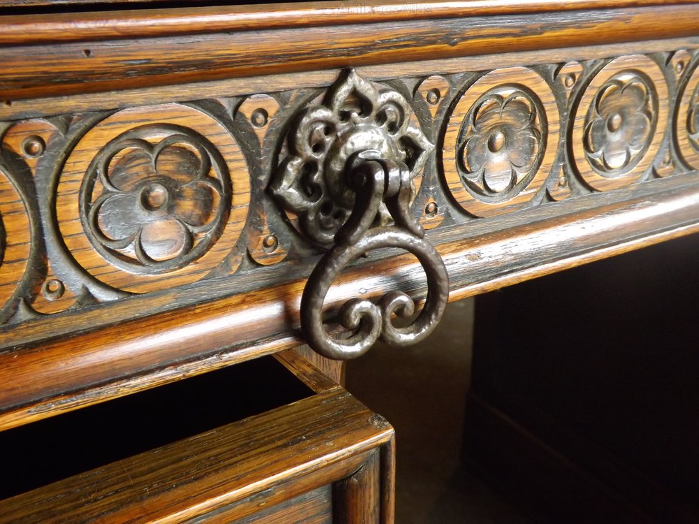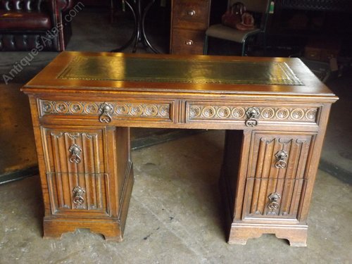 Good looking oak pedestal desk, circa 1950, a nice compact size but highly functional with its inset apple green and gilt tooled leather writing surface and the 6 ample sized drawers. A stylish desk with hand carved decoration throughout, including 17th century inspired linen fold applied panels to the main drawer fronts, with original scrolling wrought iron handles and standing on sturdy plinth and bracket feet, a little gem.Always an eclectic array of Antique and Vintage Goods in stock, please phone before travelling to view. follow us on face book/ Michael Allcroft Antiques. Any Enquiries Please Contact. Established since 1986, Third generation Antique Dealer