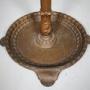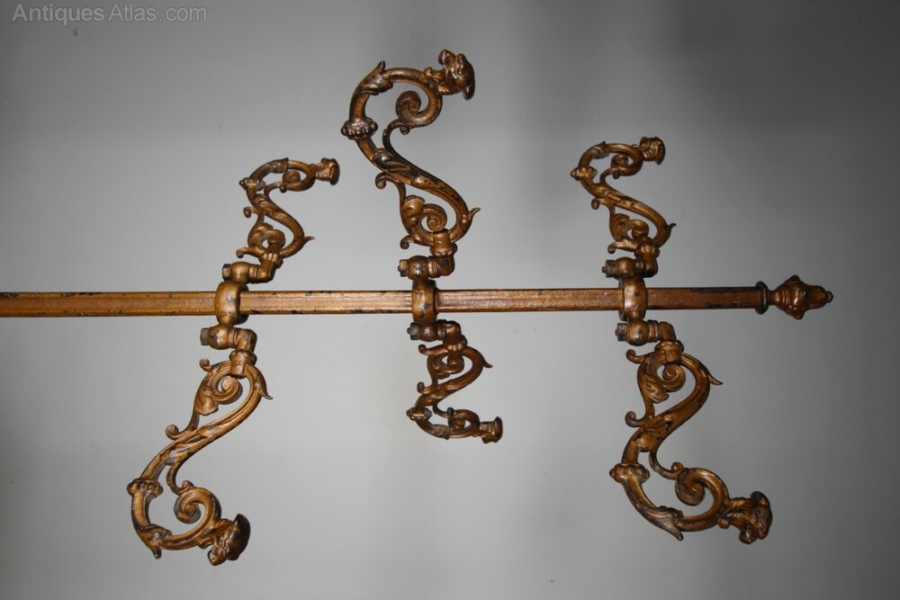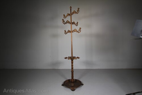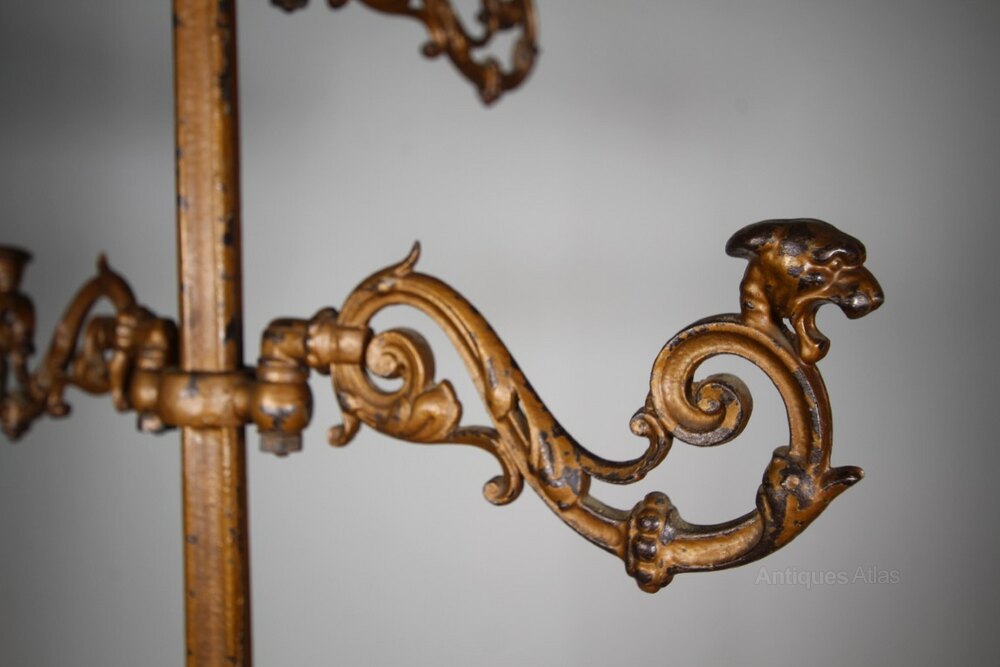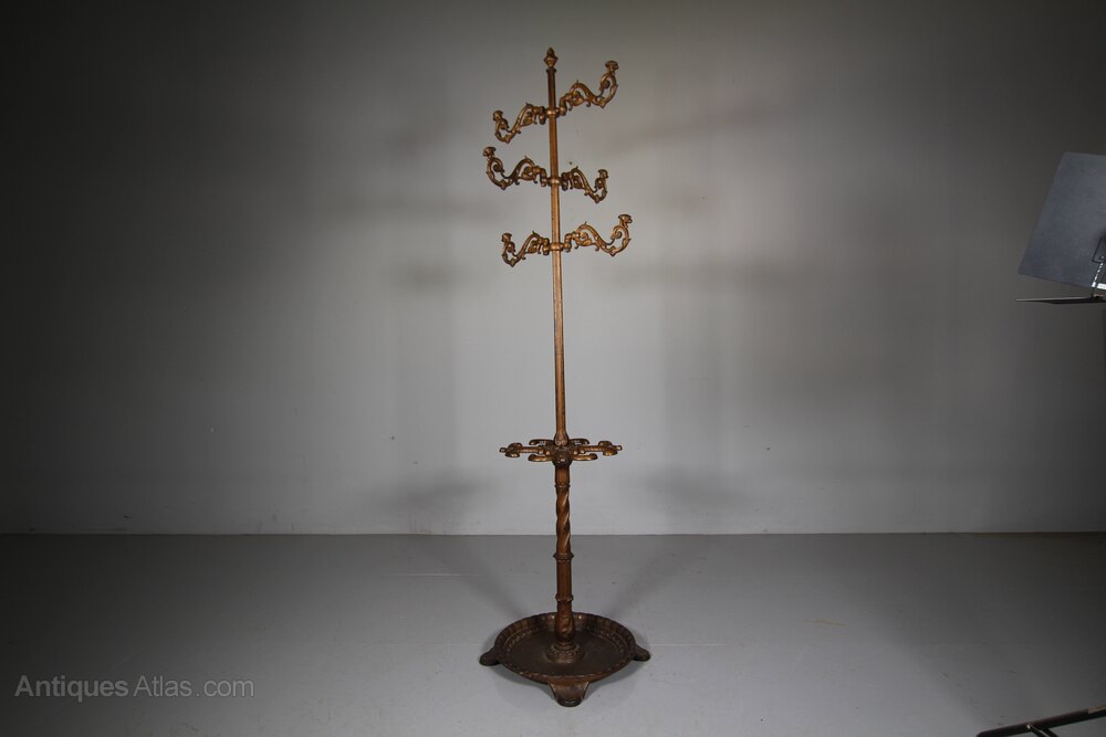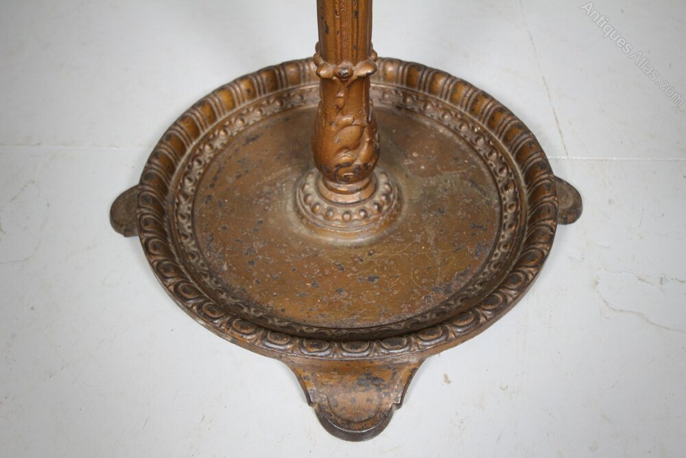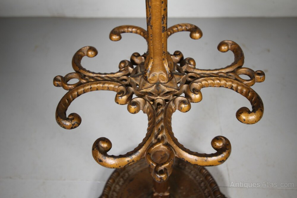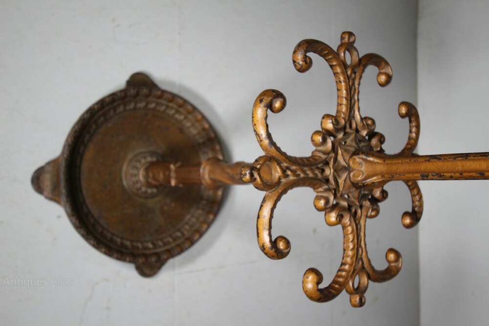 A very well cast, high quality English antique iron tall coat stand that is in excellent, complete condition with no damage and still in the original paint finish. A decorative model having six moveable hinged arms that feature leopard’s snarling heads to the ends. Below is an incorporated ornate umbrella / stick stand with a circular drip tray base standing on four shaped feet. A beautiful antique iron coat stand that has lots of decorative detailing.