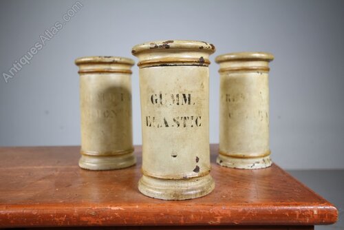 A lovely set of three, solid box wood antique chemist storage jars that are still in the original 19th century paint finish. All three are in very good condition, complete with the original jar lids that have interesting paper labels on the inside which refer to the contents. They date to around 1860.