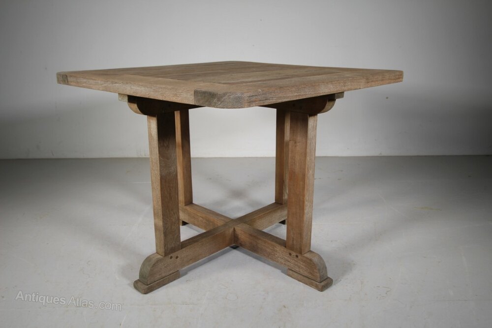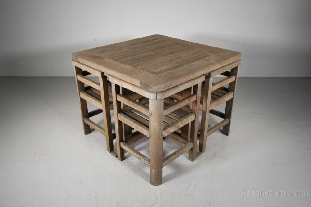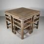 A very complete and strong example of a Heals antique solid teak garden dining set that comprises of a square garden dining table with four slatted teak garden dining chairs, that when not in use fit snugly under the table to form a neat cube. All pegged construction and all a very good even colour. Perfect for garden dining but they look smart on terraces, balconies and courtyard settings.