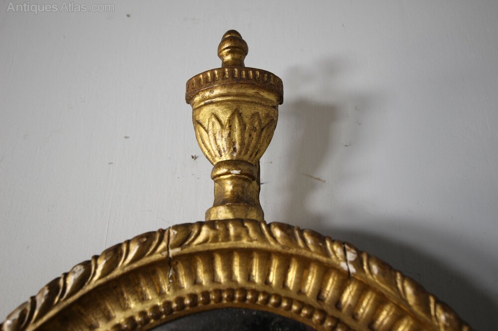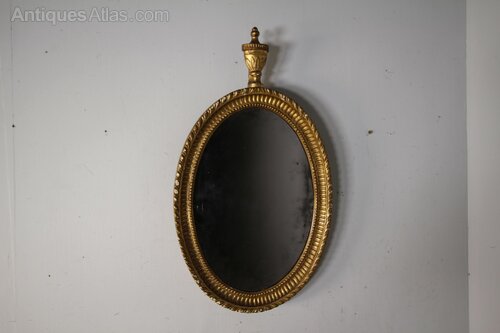 Beautiful English 18th Century Antique Carved & Gilt Oval MirrorA simple, yet well made Georgian antique wall mirror that is oval in shape and adorned with a urn finial to the top. Hand carved in pine and finished in the original gilt. Also complete with the lovely original mirror plate and good original pine backboards. In excellent condition. A decorative English 18th century antique oval wall mirror that dates to around 1760.