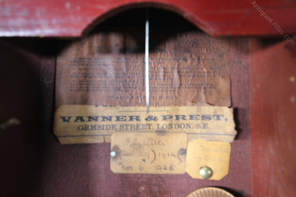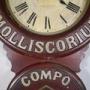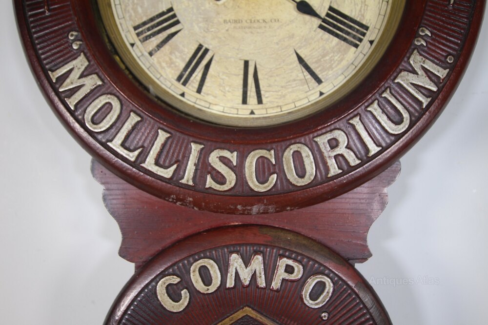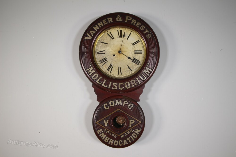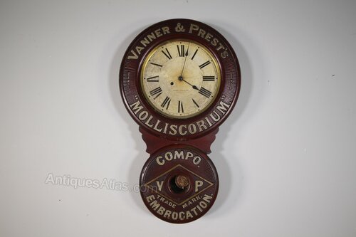 A wonderful decorative 19th century advertising wall clock by Vanner & Prests. This would have hung in a Saddlers shop to advertise Molliscorium which is a leather softening compound used on saddles and other equestrian leather goods. This is a wonderful example, in superb original working condition and in the original paint finish. Complete with the original Baird Clock Co face and pendulum movement, inside is the original operating instructions label. Dates to 1890.