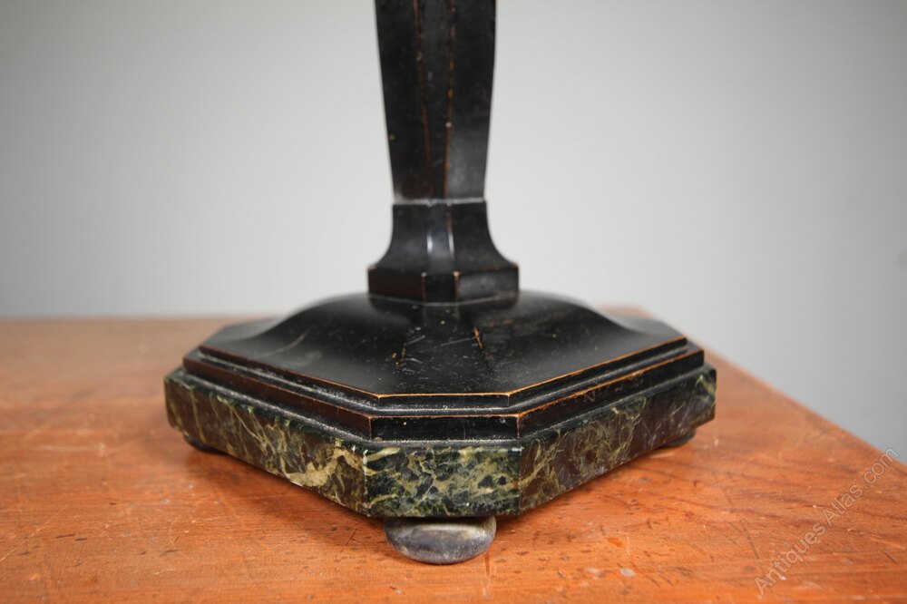 This is a handsome Edwardian tall antique marble table lamp that has an octagonal marble base on four squat bun feet with a lovely original ebonised walnut stem. Superb quality and condition, newly rewired using traditional fabric twisted flex and PAT tested. Dates to 1900.
