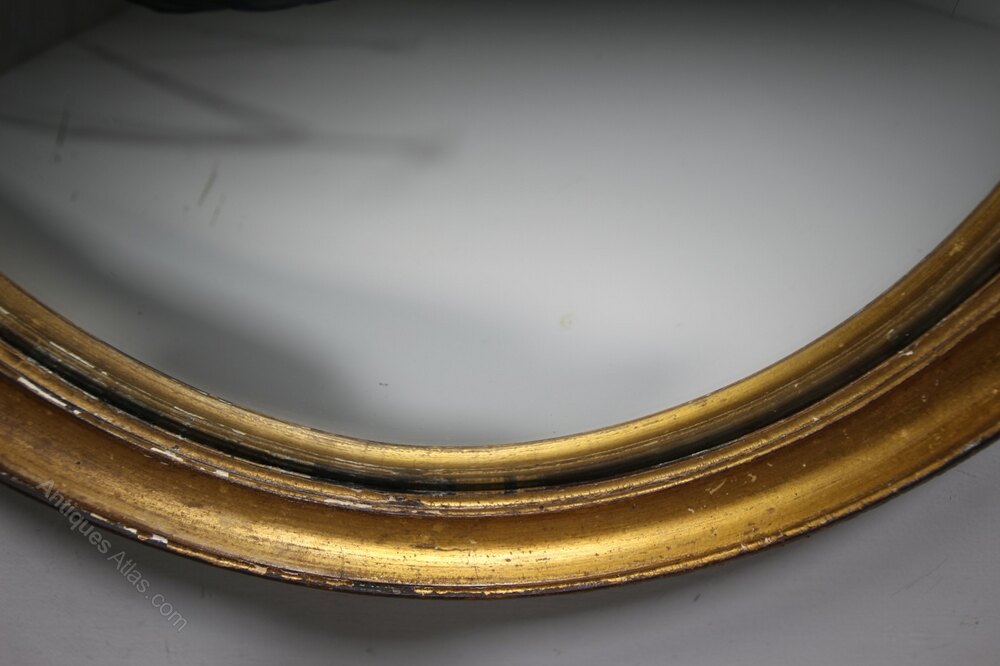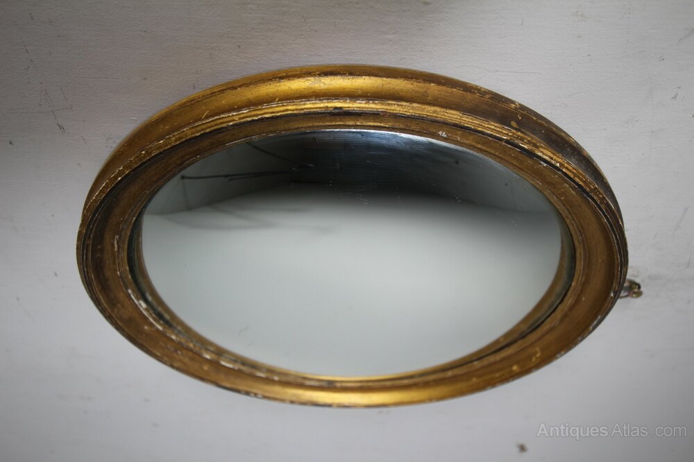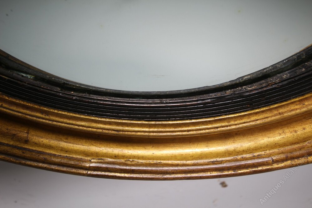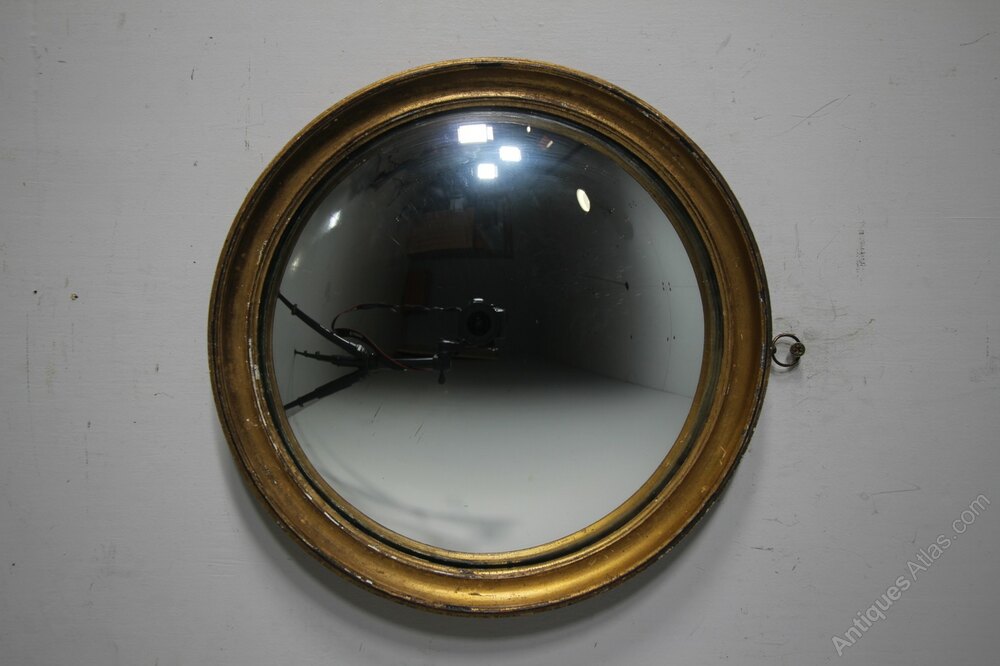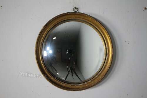 A simple, quality made English early 19th century antique convex wall mirror in the original gilt finish. A lovely size, complete with the original convex mirror plate, backboards and brass ring hanger to the top. In very good condition with great reflection on the convex. Dates to 1815.