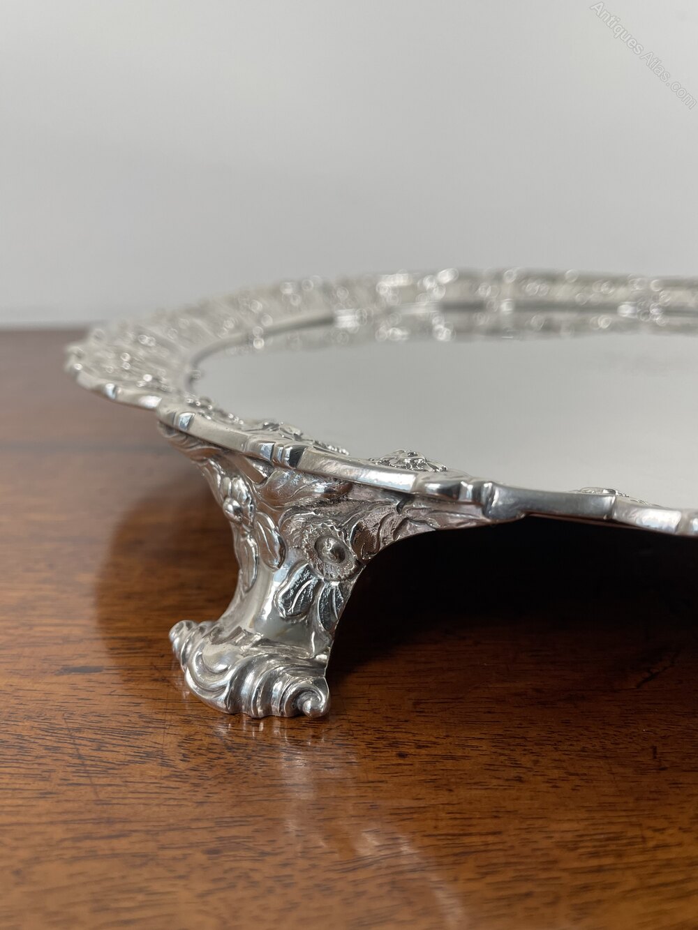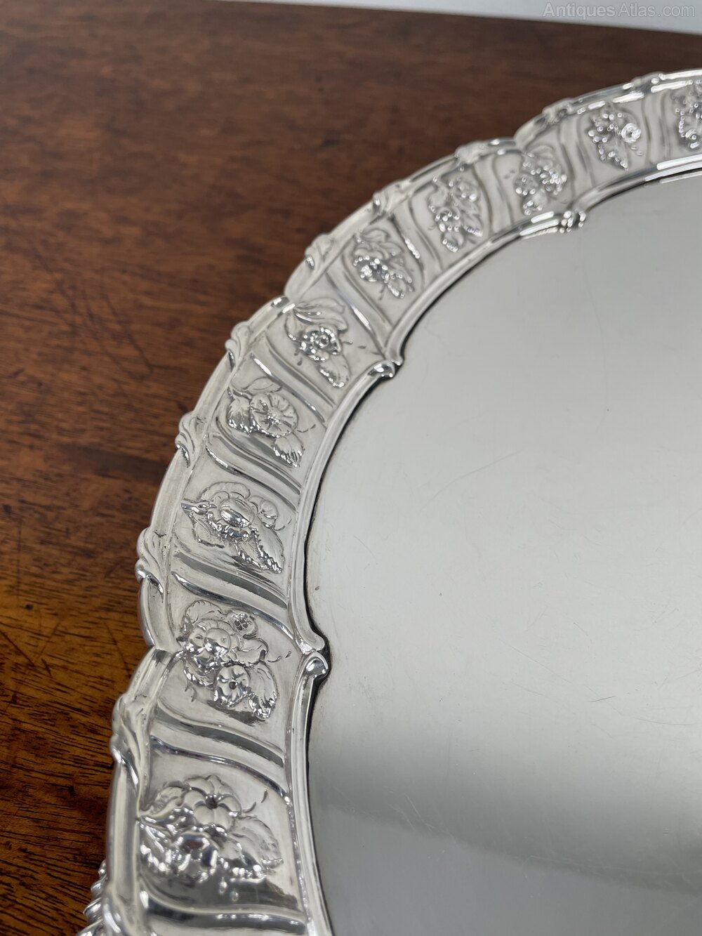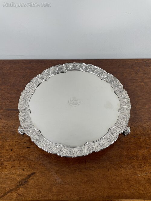 18th century cast border silver salver by Richard Rugg.With a cast foliate panelled border and three cast feet.
