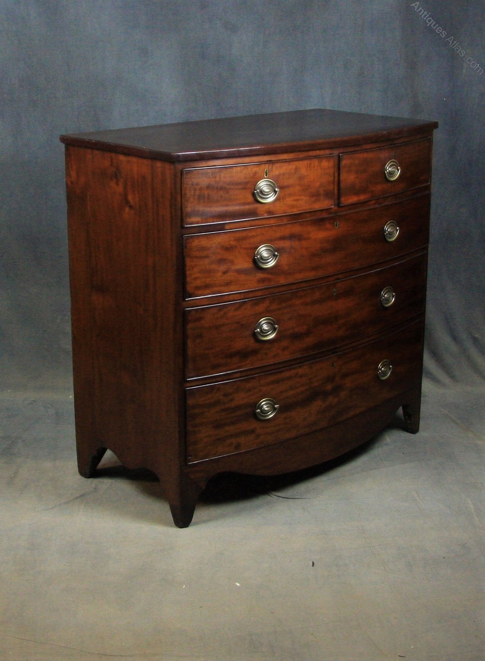 Good quality Regency mahogany bow front chest of drawers having 2 short over 3 long chest of drawers with oval brass handles and oak lined drawer boxes all standing on splay bracket feet.circa 1820