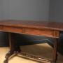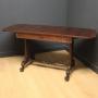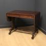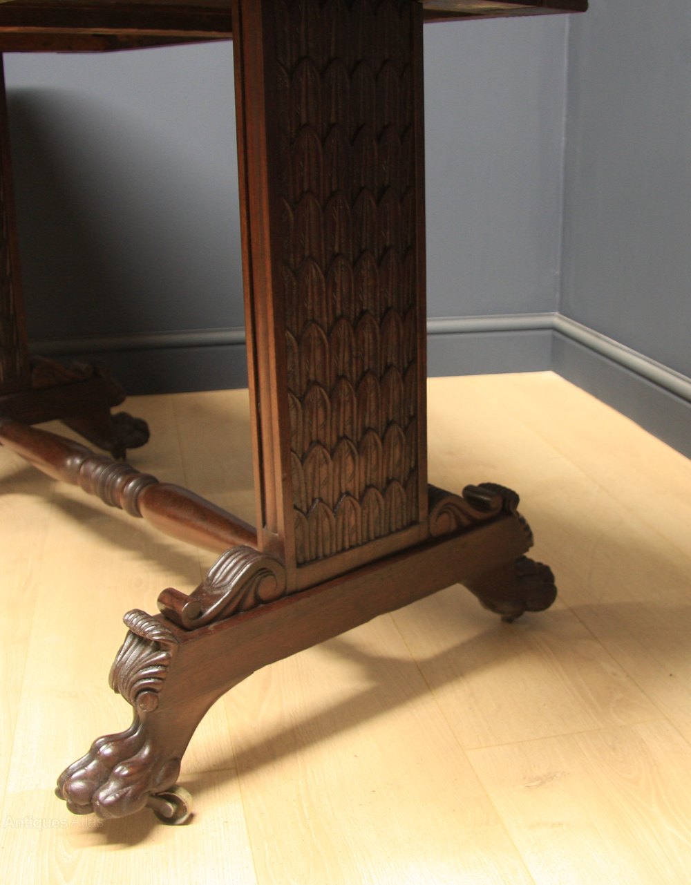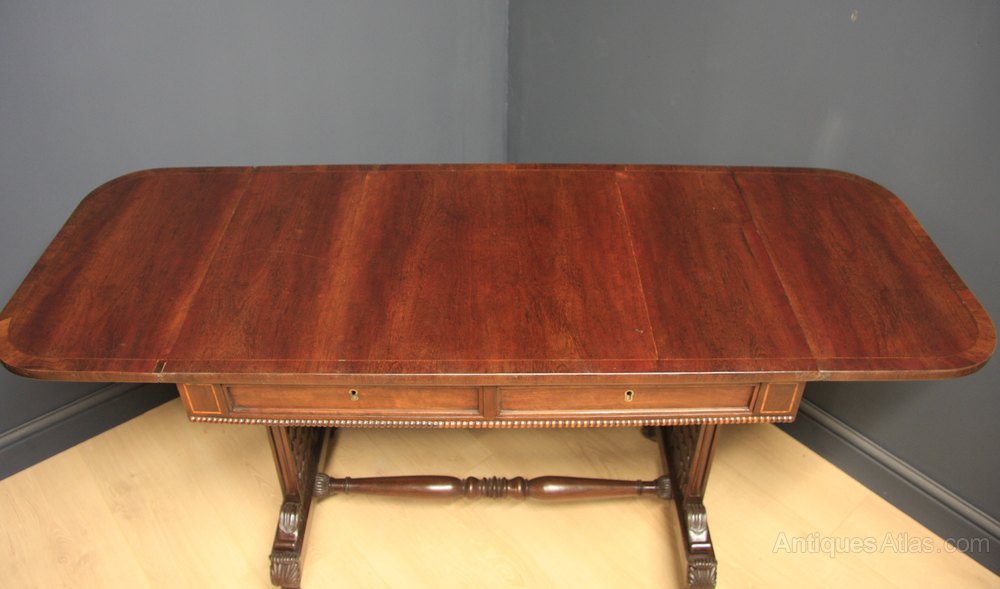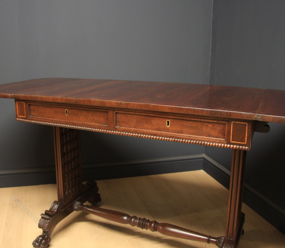 Excellent quality Regency mahogany sofa table of good proportions having cross banded and inlaid top with drop leaves over 2 drawers with faux drawers to the rear over twin pillar supports with leaf carving leading to base with scroll carvings and lions paw feet, each support united by a turned stretcher.circa 1820