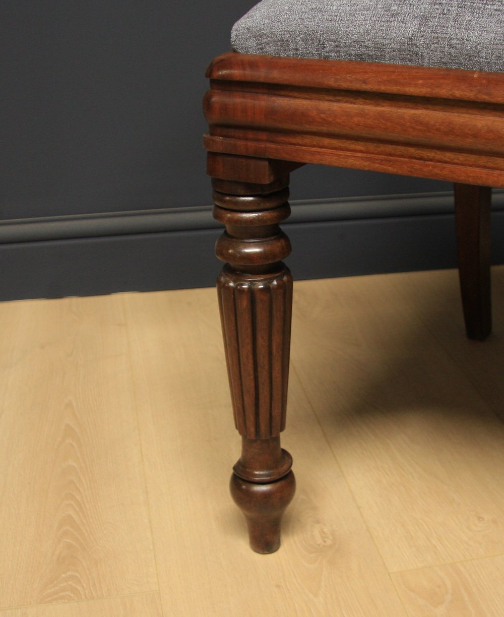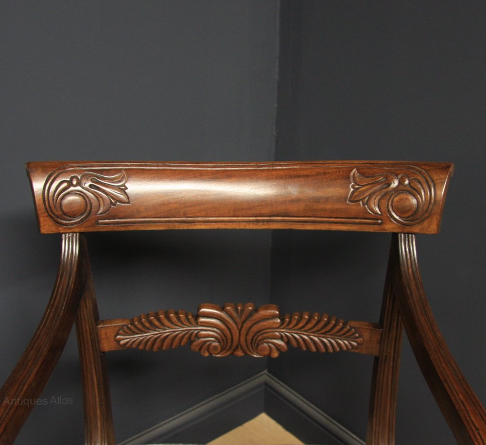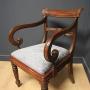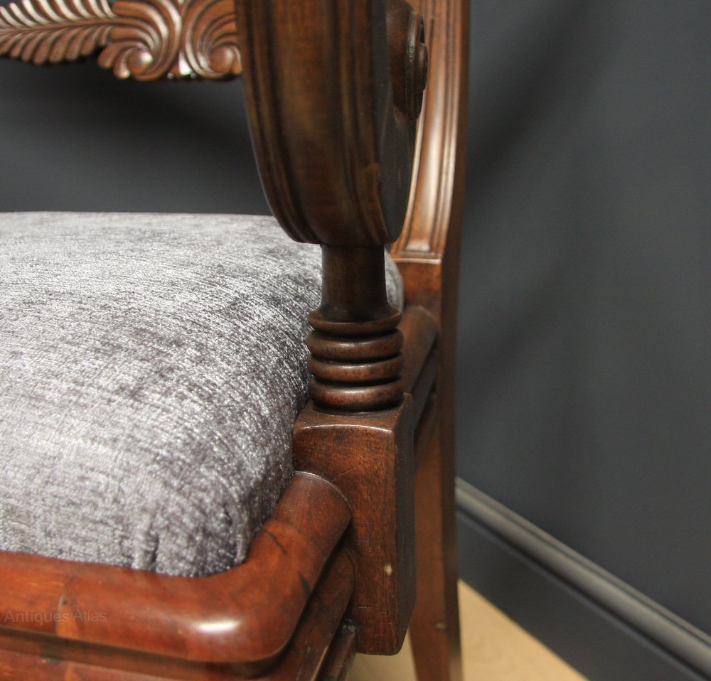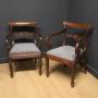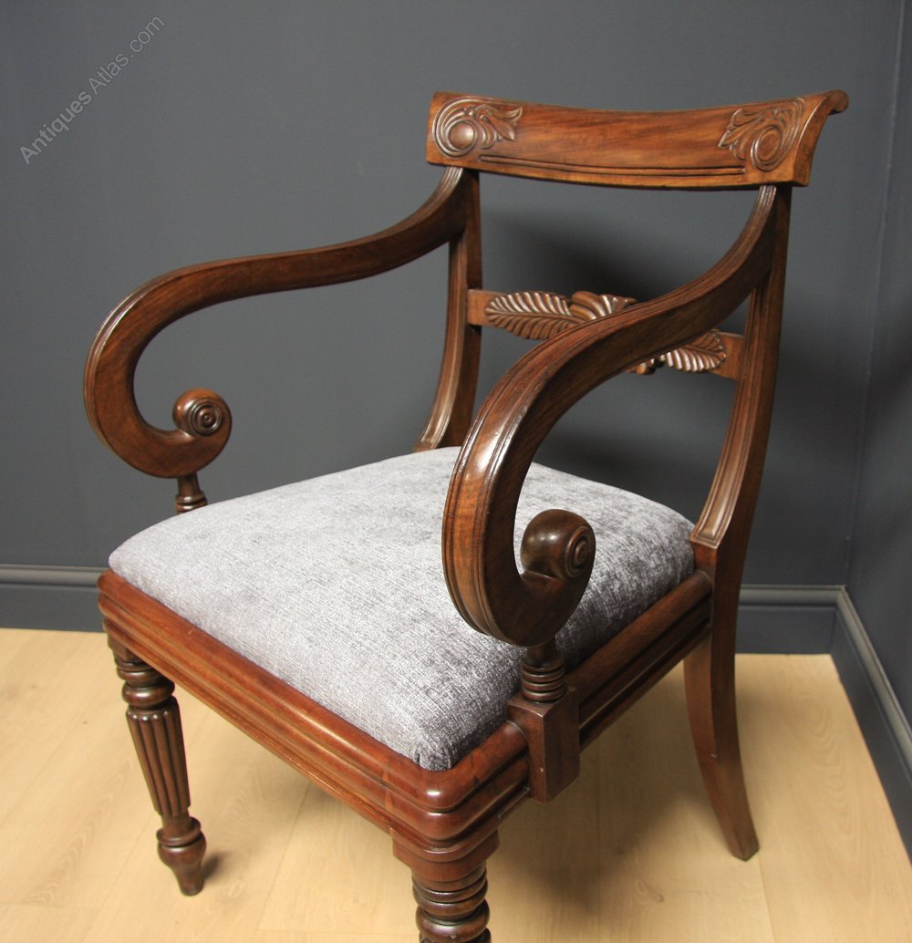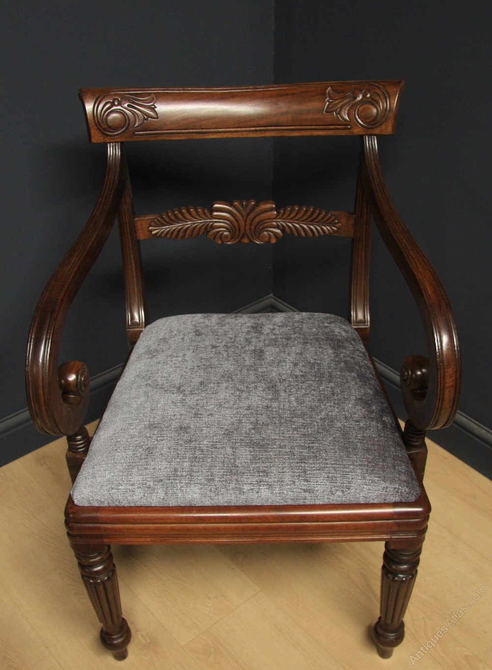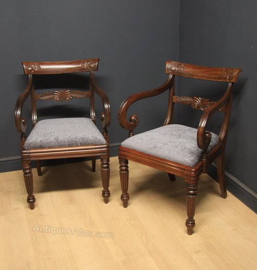 Excellent quality pair of William IV mahogany carver chairs having carved and shaped top rail over carved mid rail open scroll arms with turned support with drop in seat with chenille cover all standing turned and reeded legs.circa 1830