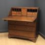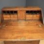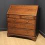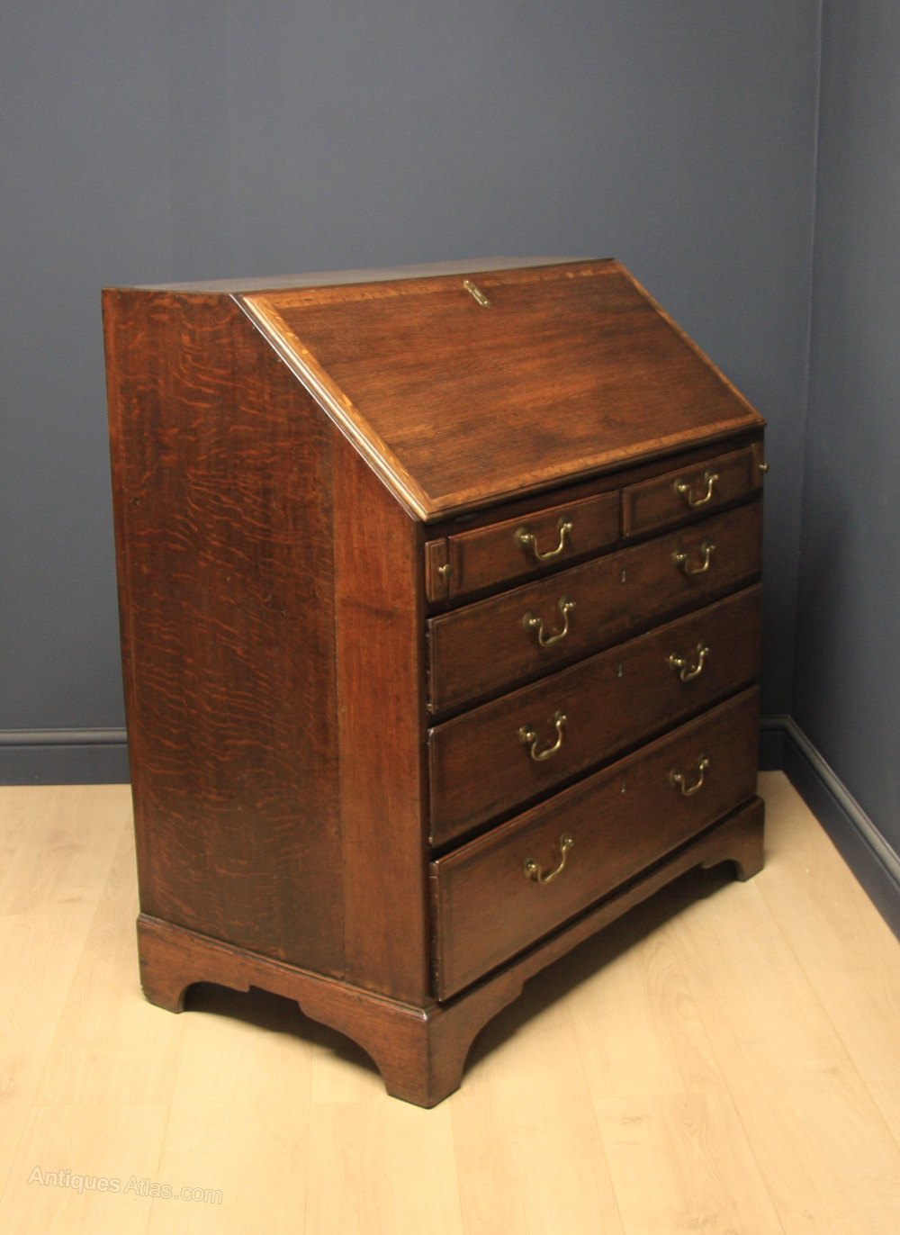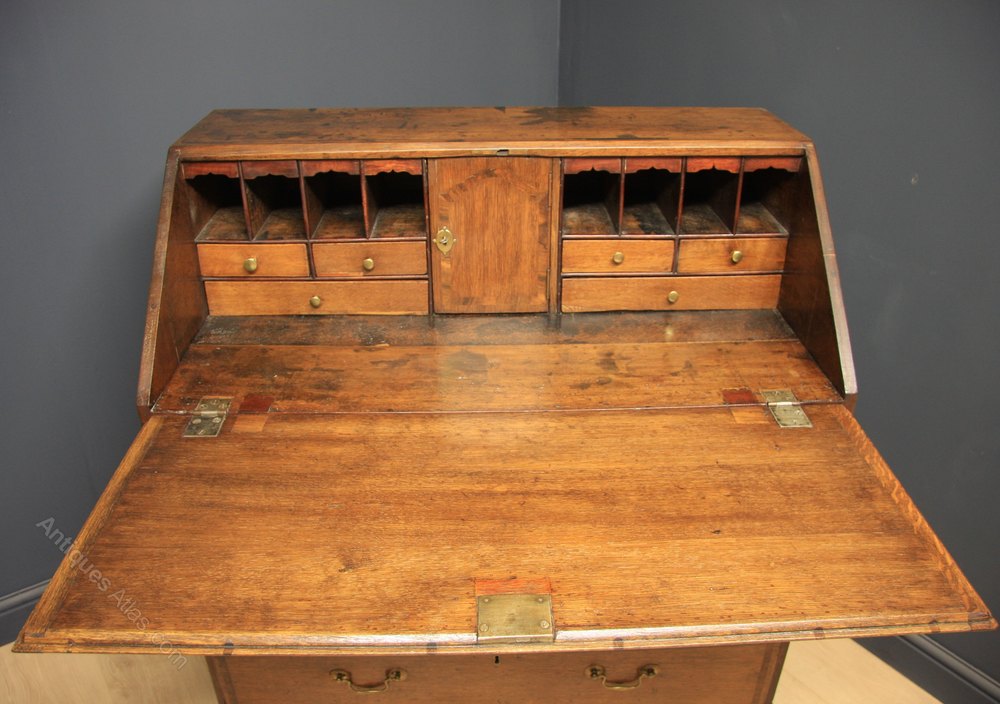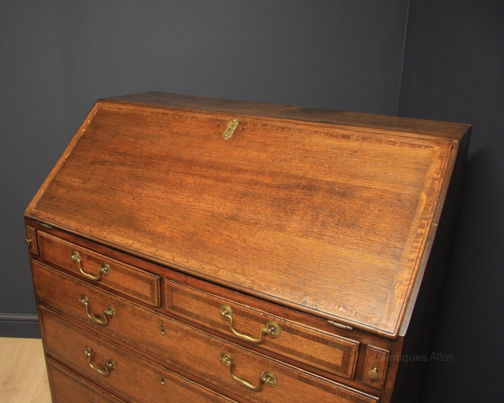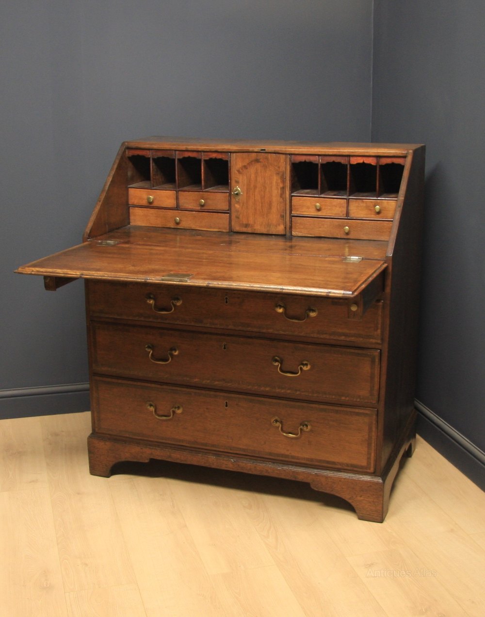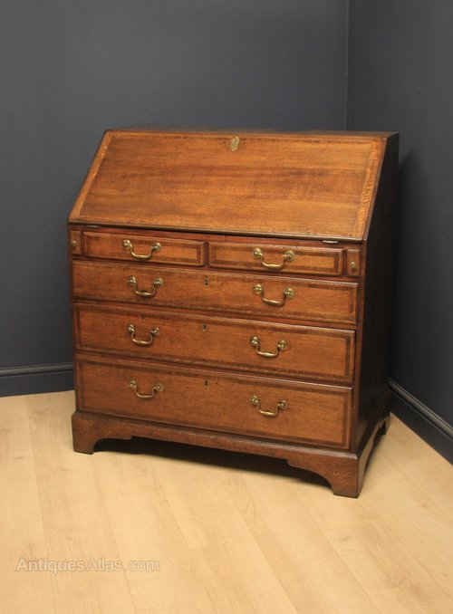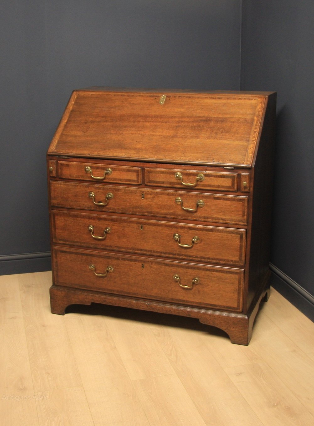 Good quality George II oak bureau with crossbanded fall front that opens to reveal writing surface with small drawers and pigeon holes over 2 short over 3 long graduated drawers with brass swan neck handles all standing on bracket feet.circa 1750