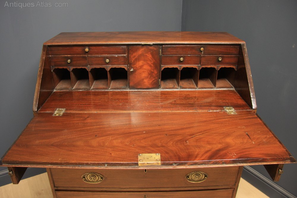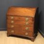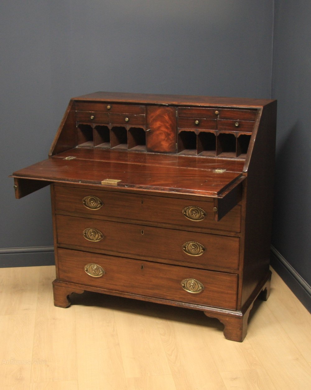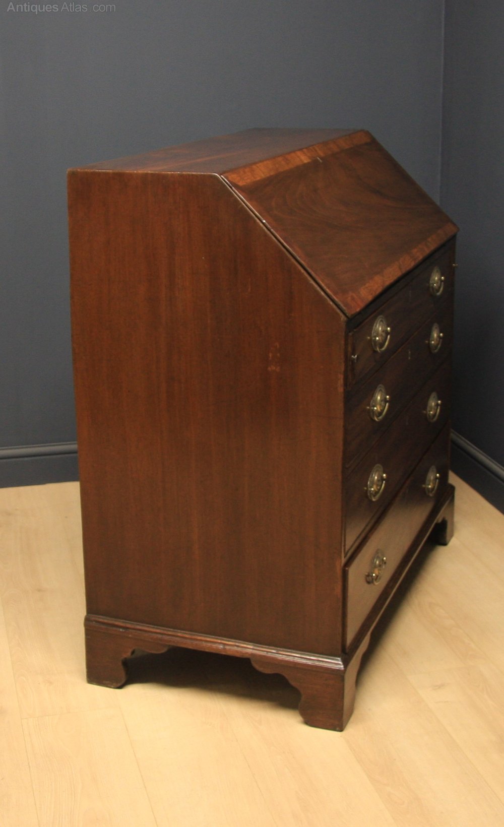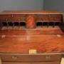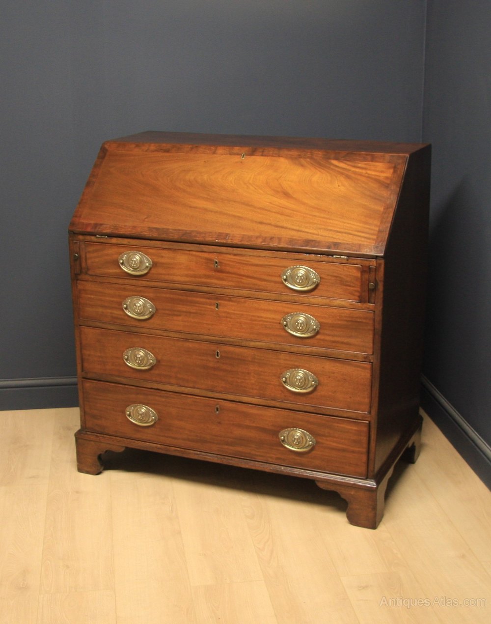 Good quality Regency mahogany bureau of good proportions having figured and crassbanded fall front that opens to reveal writing surface with small drawers and pigeon holes over 4 long graduated drawers with oval brass handles all standing on bracket feet.circa 1820