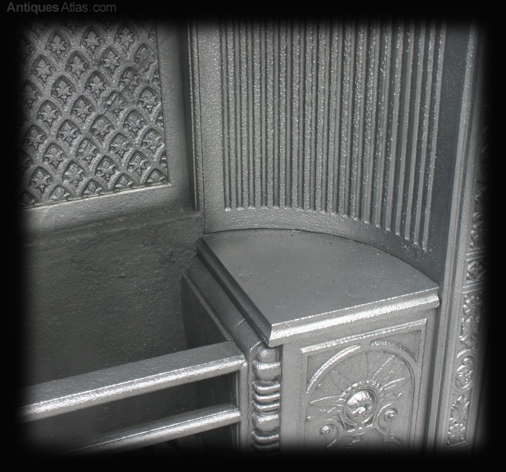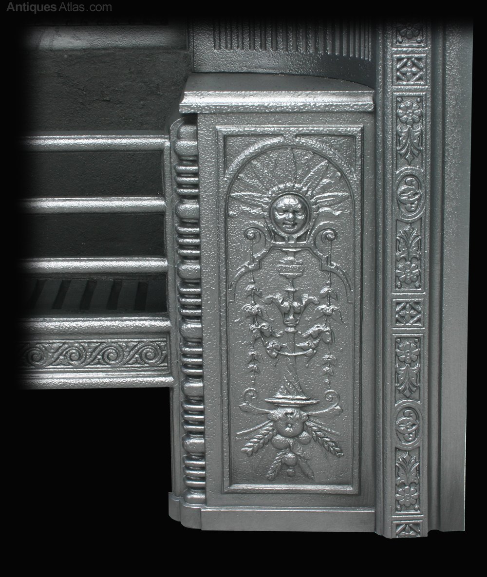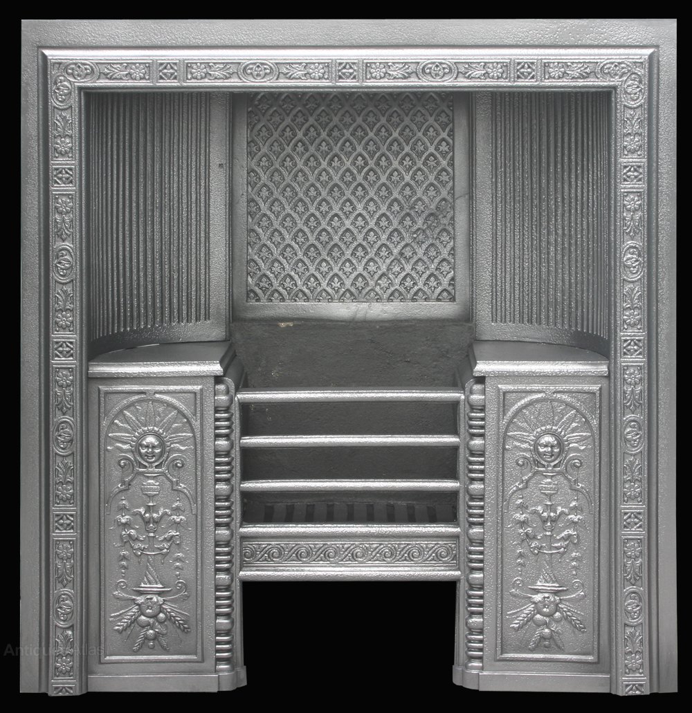 Antique Victorian cast iron hob register grate in the Aesthetic manner.Circa 1880