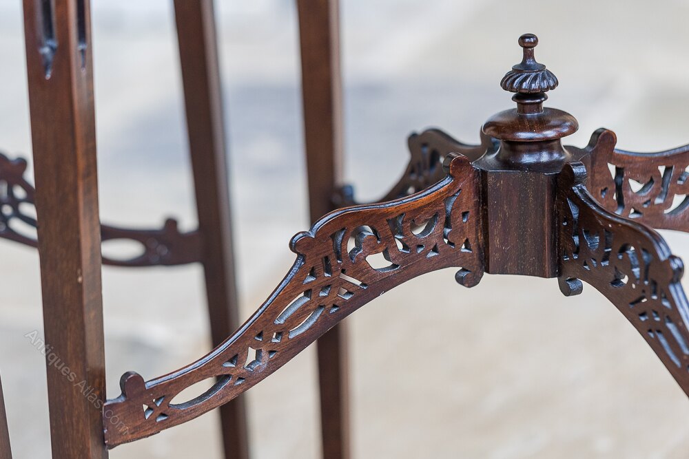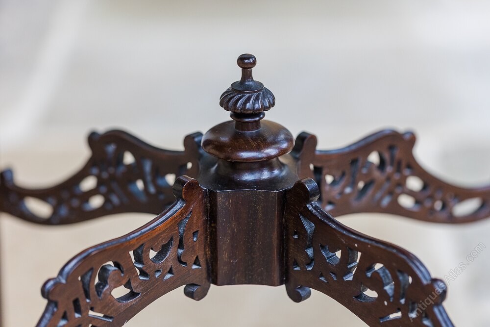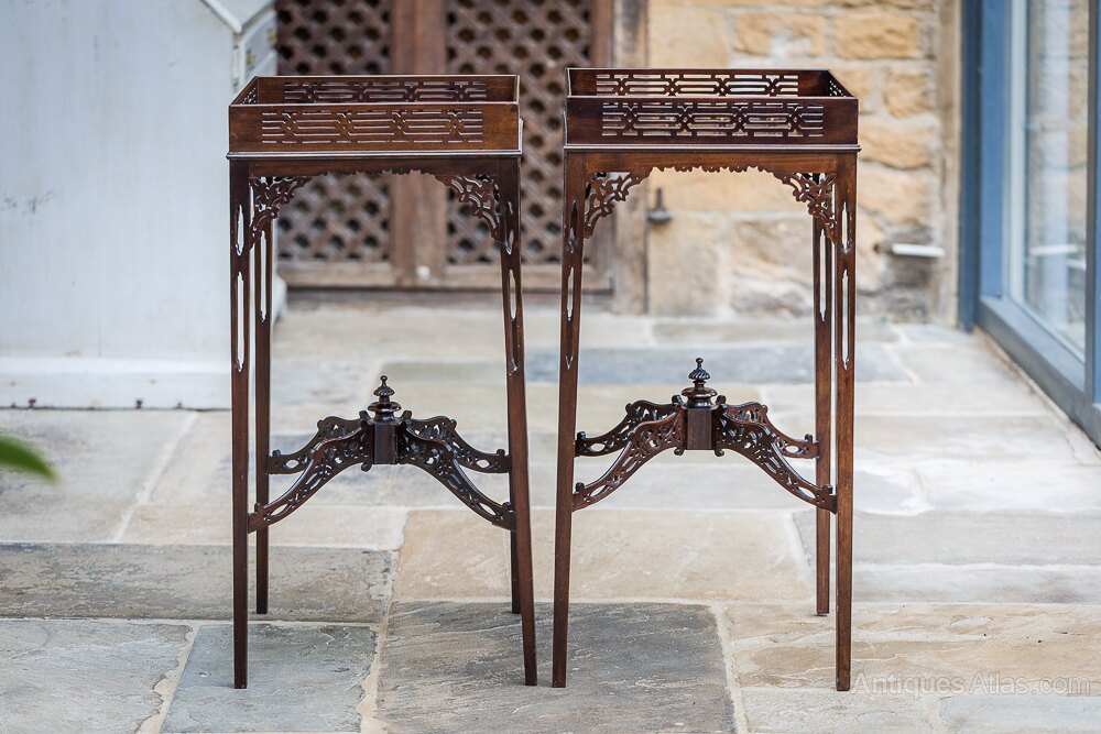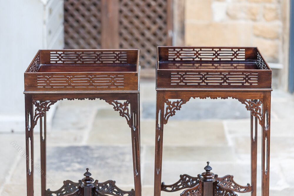 Nineteenth Century Mahogany Chinese Chippendale Side tables with pierced up stands above pierced apron brackets and raised on four tapering legs united by pierced cross stretches surmounted by turned finials.38cm x 38cm x 81cm