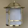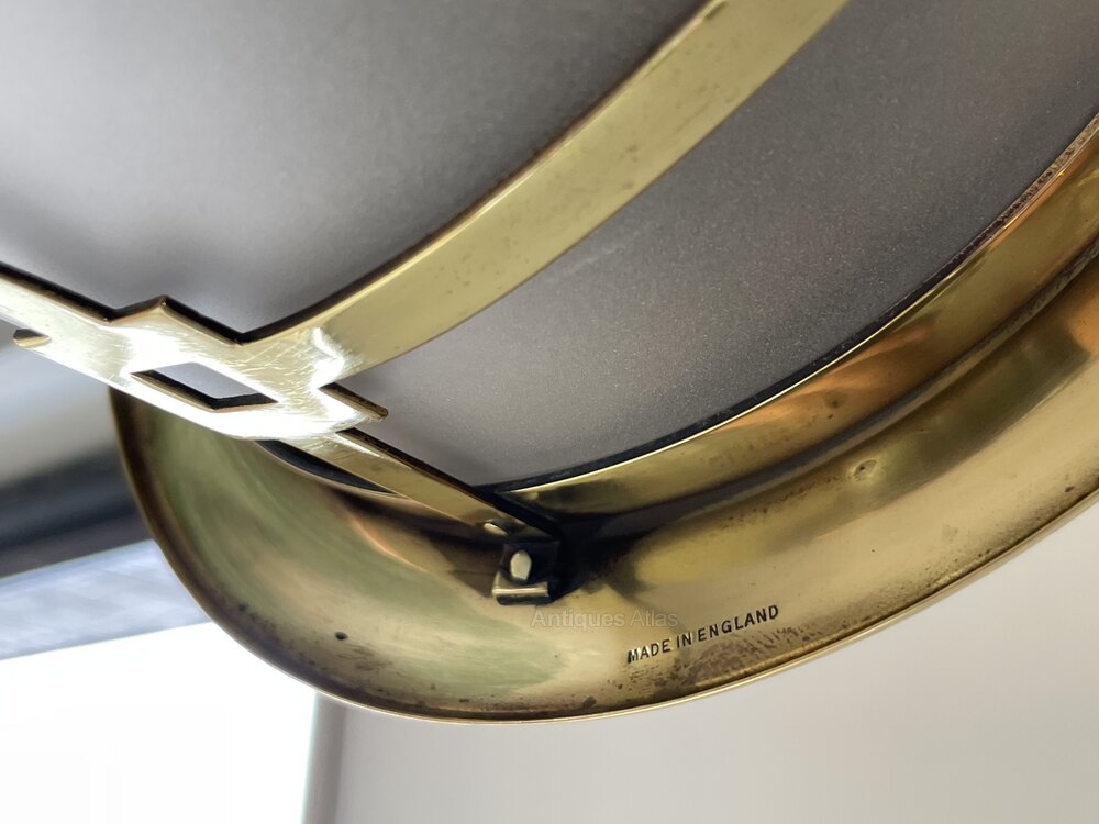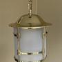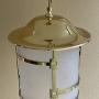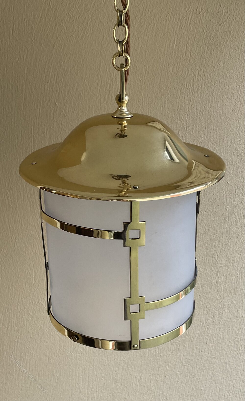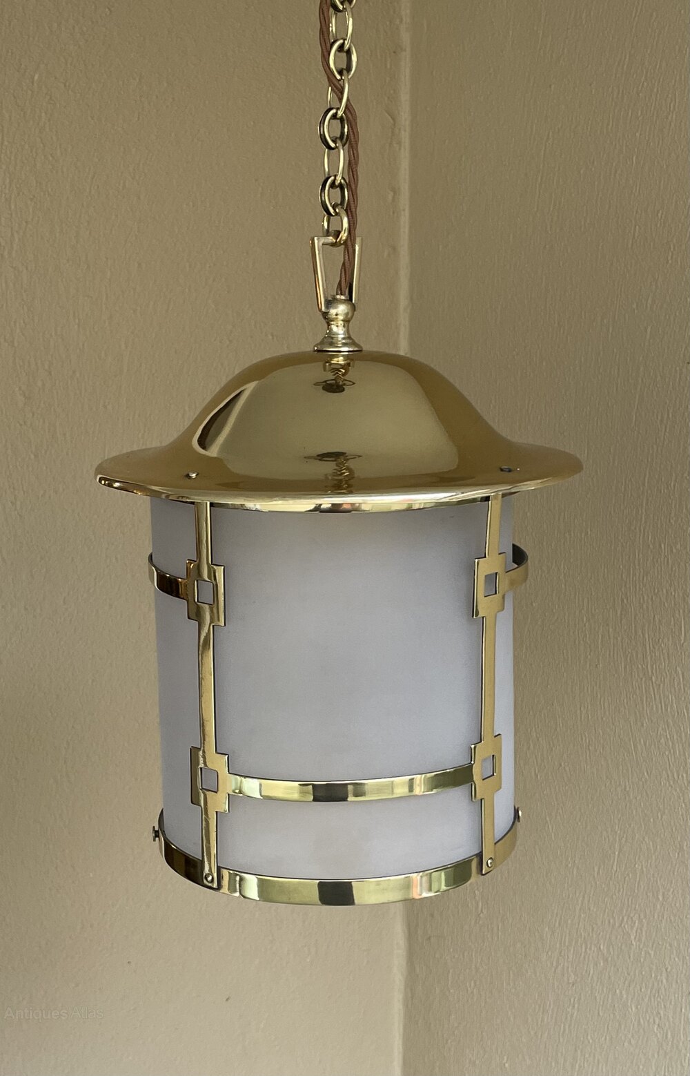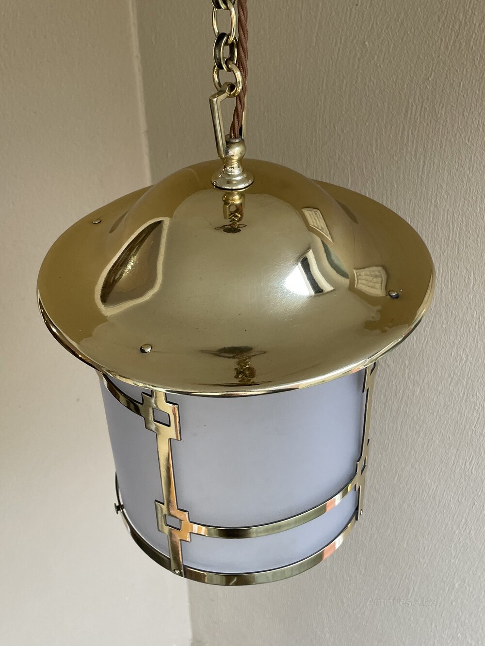 A very good English Art Deco brass hall lantern, with stlyish banded framework and original frosted glass shade. Original chain and ceiling rose, professionally repolished and fully rewired in period style braided flex.A wonderful addition to any home.