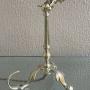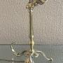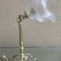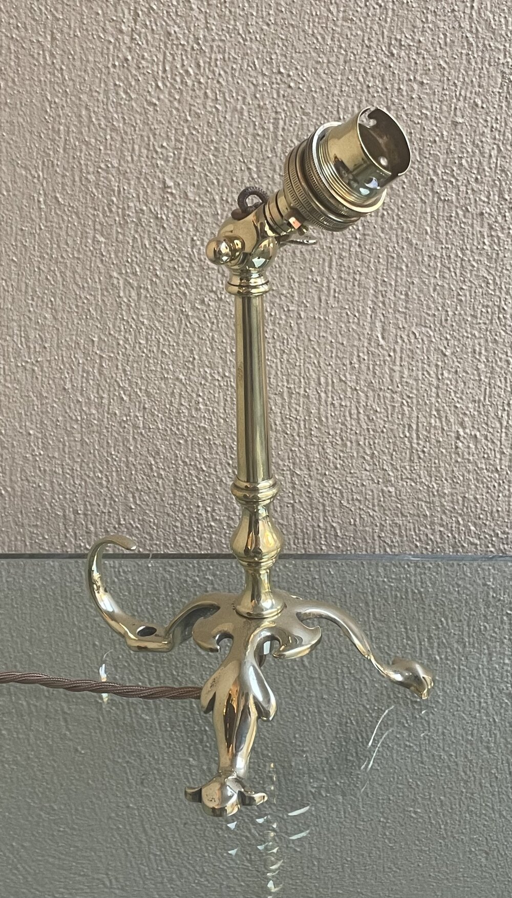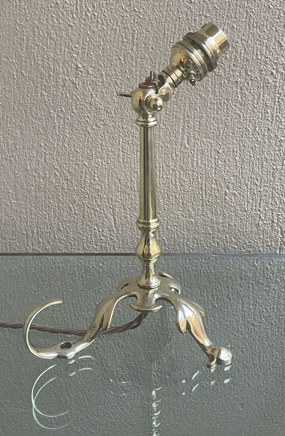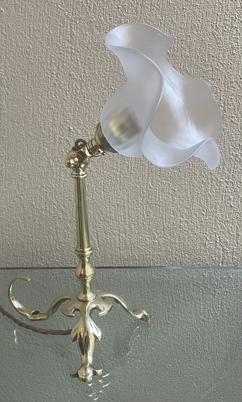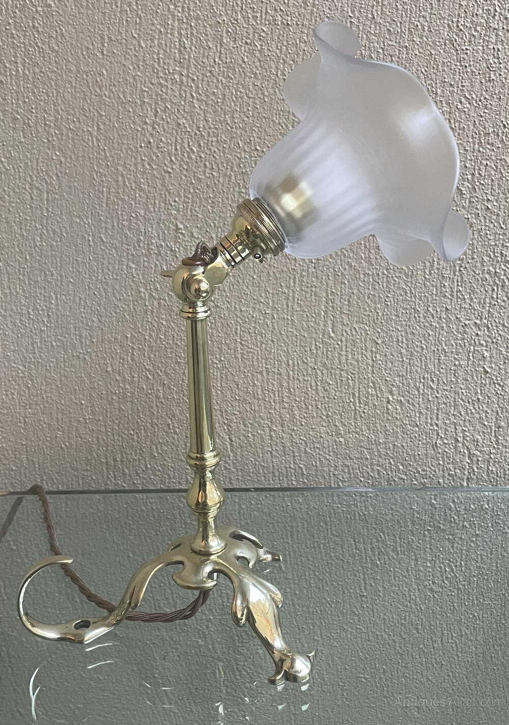 An Arts & Crafts period brass Pullman table lamp (circa 1900-1910), offered with frosted glass shade. The angle of the bulb holder can be changed from vertical postion and is adjustable we would recommend fitted to table as originally intended if requiring to tilt shade to any great extent to avoid becoming unbalanced. The underside of lamp is stamped with lozenge design registration mark.The lamp has been professionally polished and fully rewired in period style braided flex. PAT safety tested.